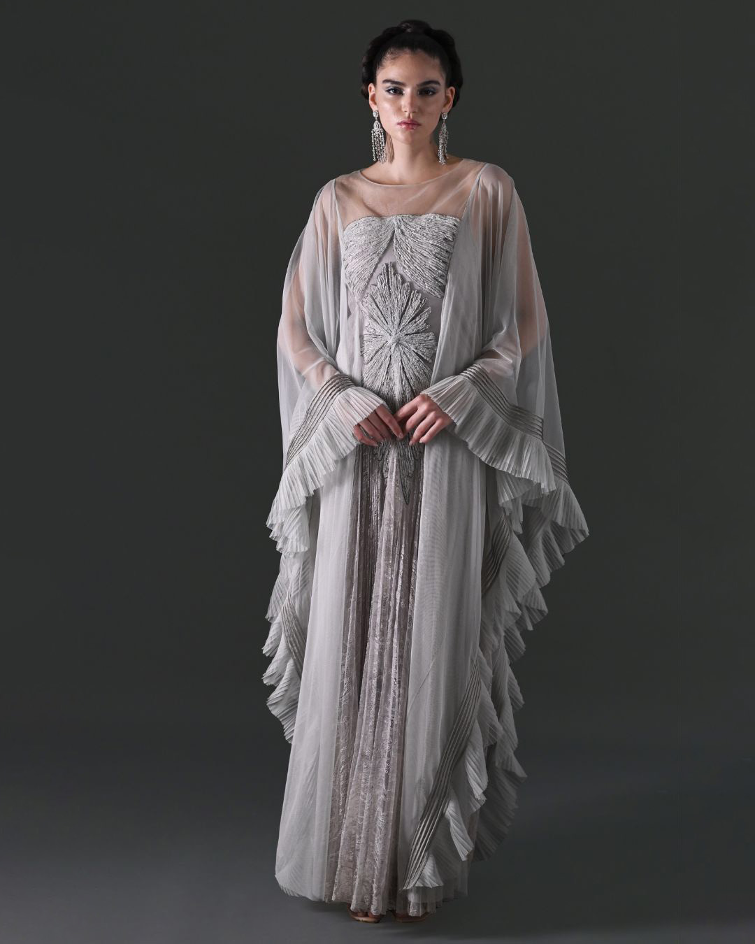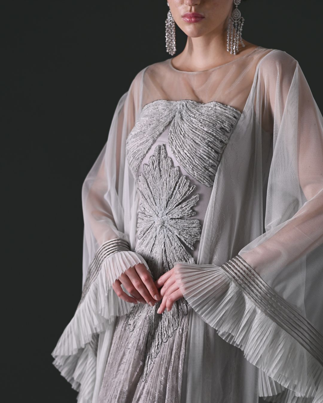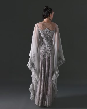 A fitted bodice with an off-shoulder neckline, which accentuates style.