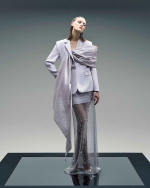 A bold reinvention of tailored elegance, this sculpted old rose jacket features sharp lapels, a fitted waist, and an unexpected open back for a touch of allure. The design is elevated by a taffeta draped panel that cascades from the shoulder, adding architectural movement and asymmetrical intrigue. A perfect balance of modern sophistication and avant-garde design, this piece redefines the statement jacket.