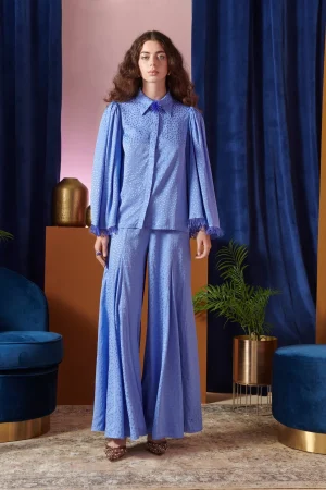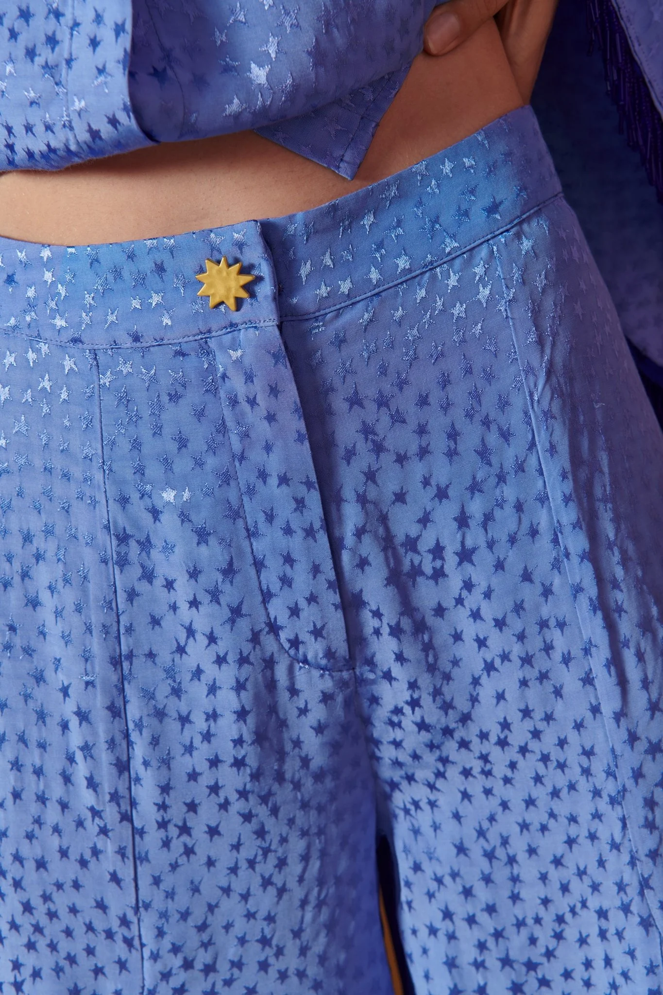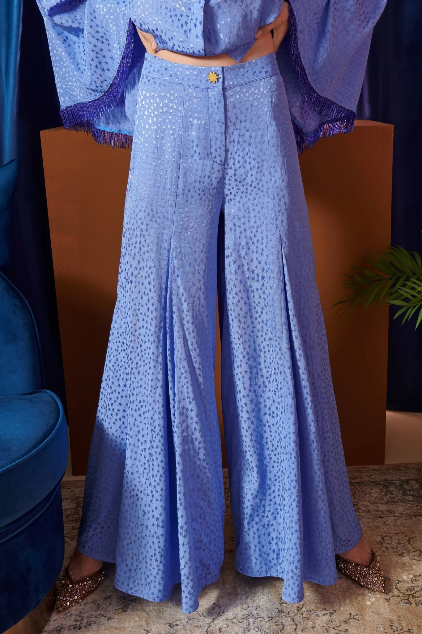 Make a statement in our Lynx Pants, crafted from shimmering light blue fabric adorned with delicate star motifs.
