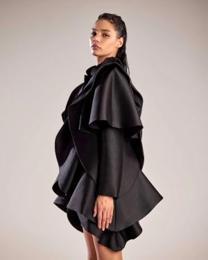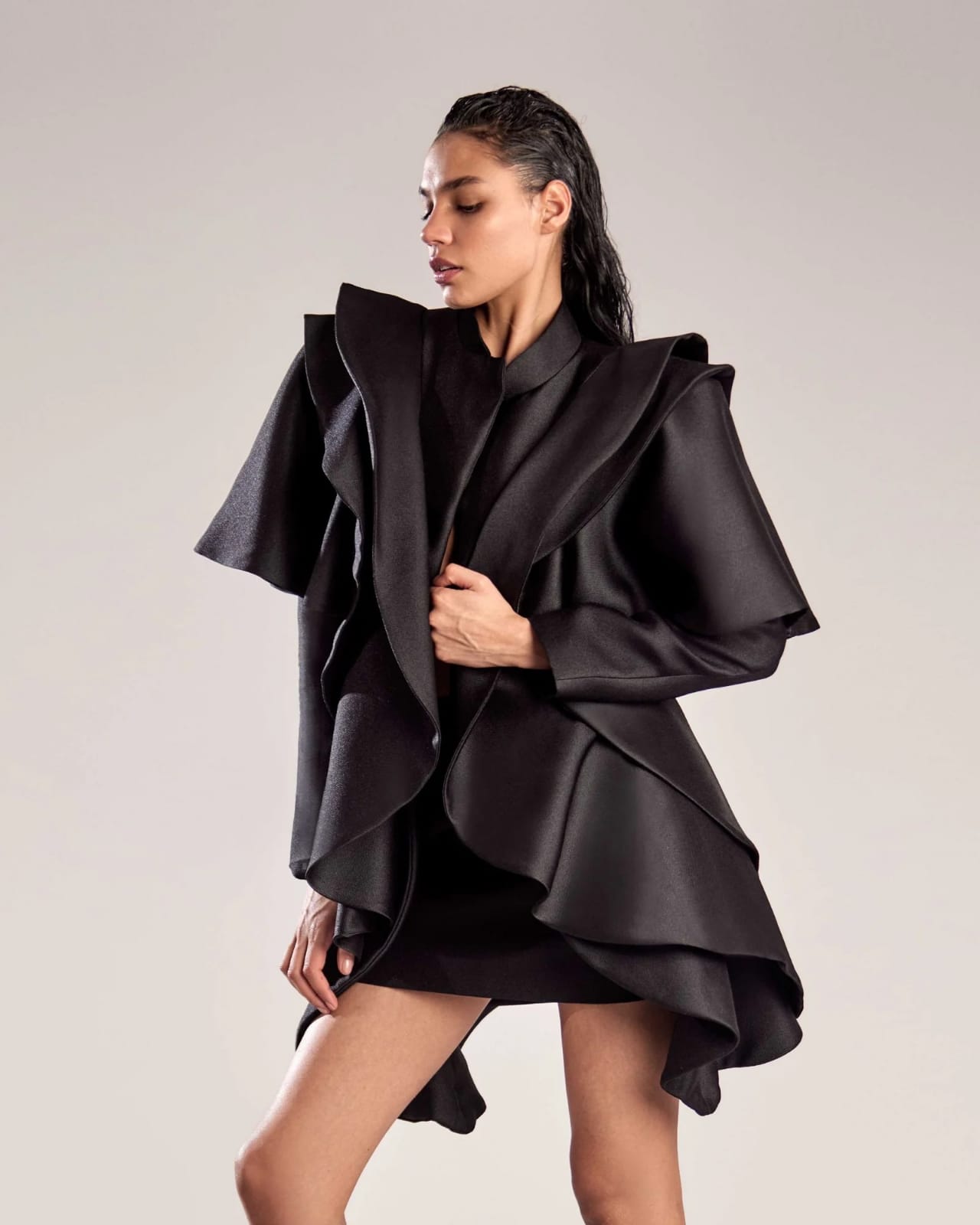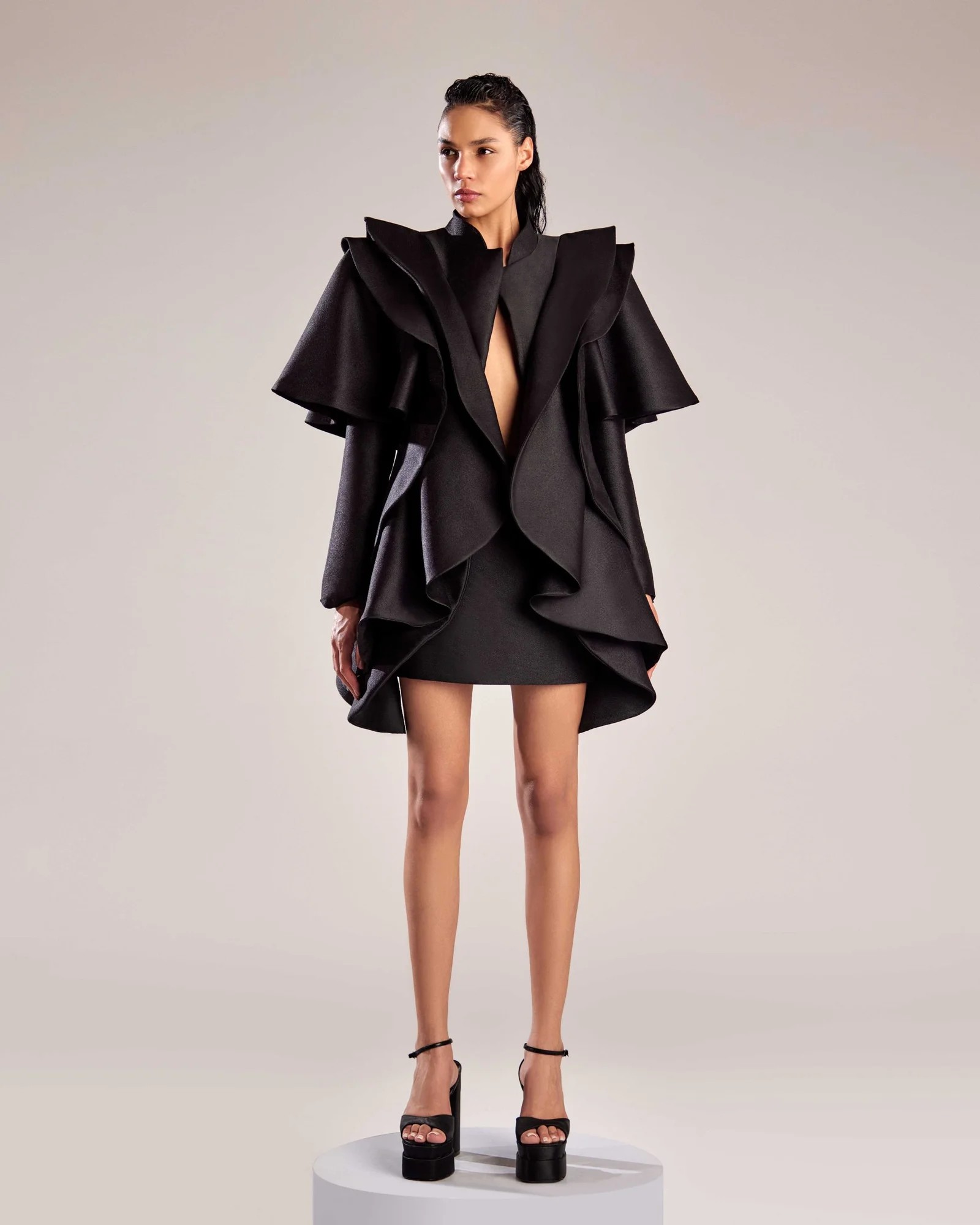 Introducing our stunning Black Mikado Piqué jacket, designed to make a bold fashion statement. This jacket features dramatic, layered ruffles and a structured silhouette, creating an eye-catching and avant-garde look. The high collar and open front add a modern touch, perfect for elevating any ensemble. This jacket can be beautifully matched with our miniskirt.