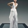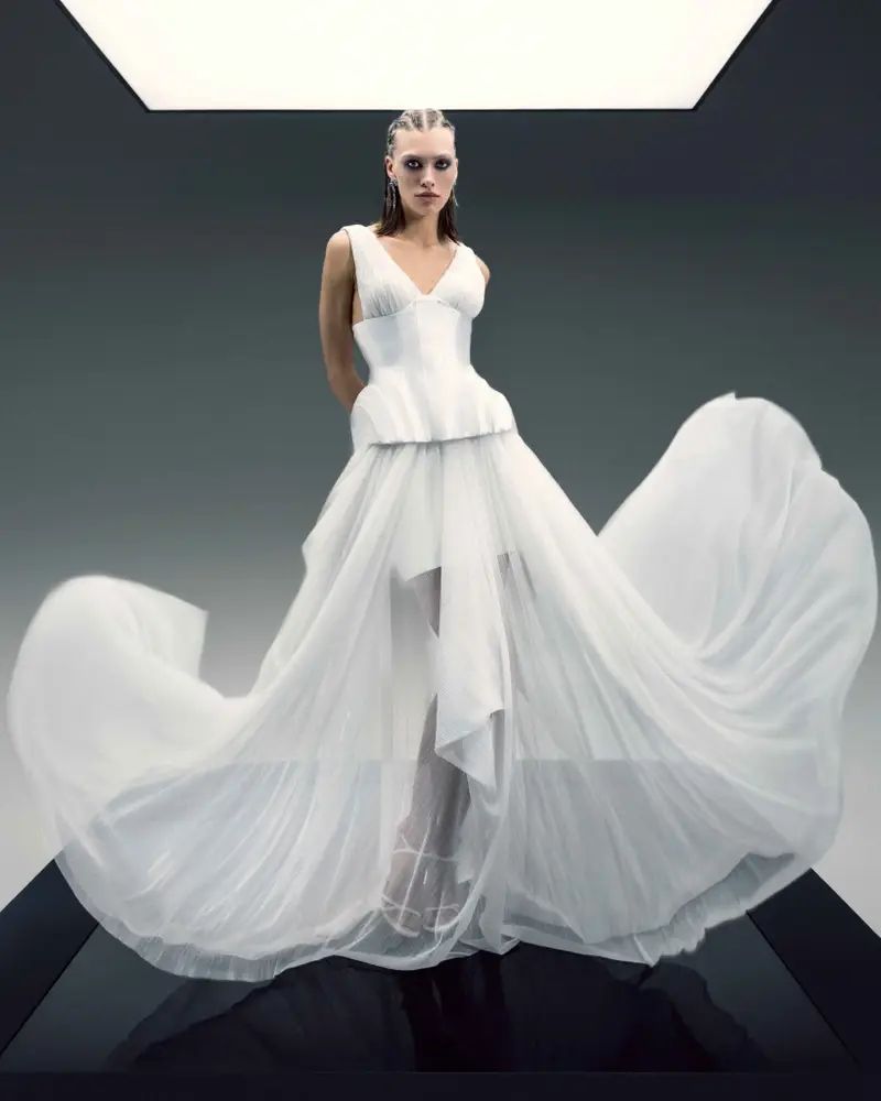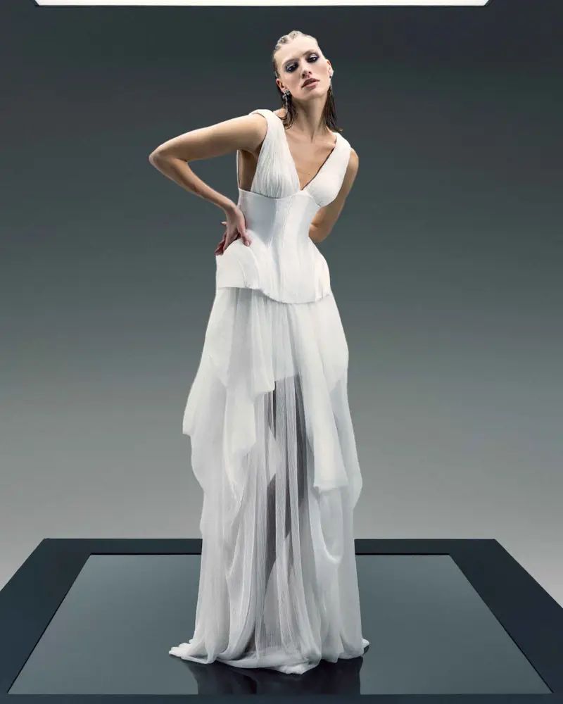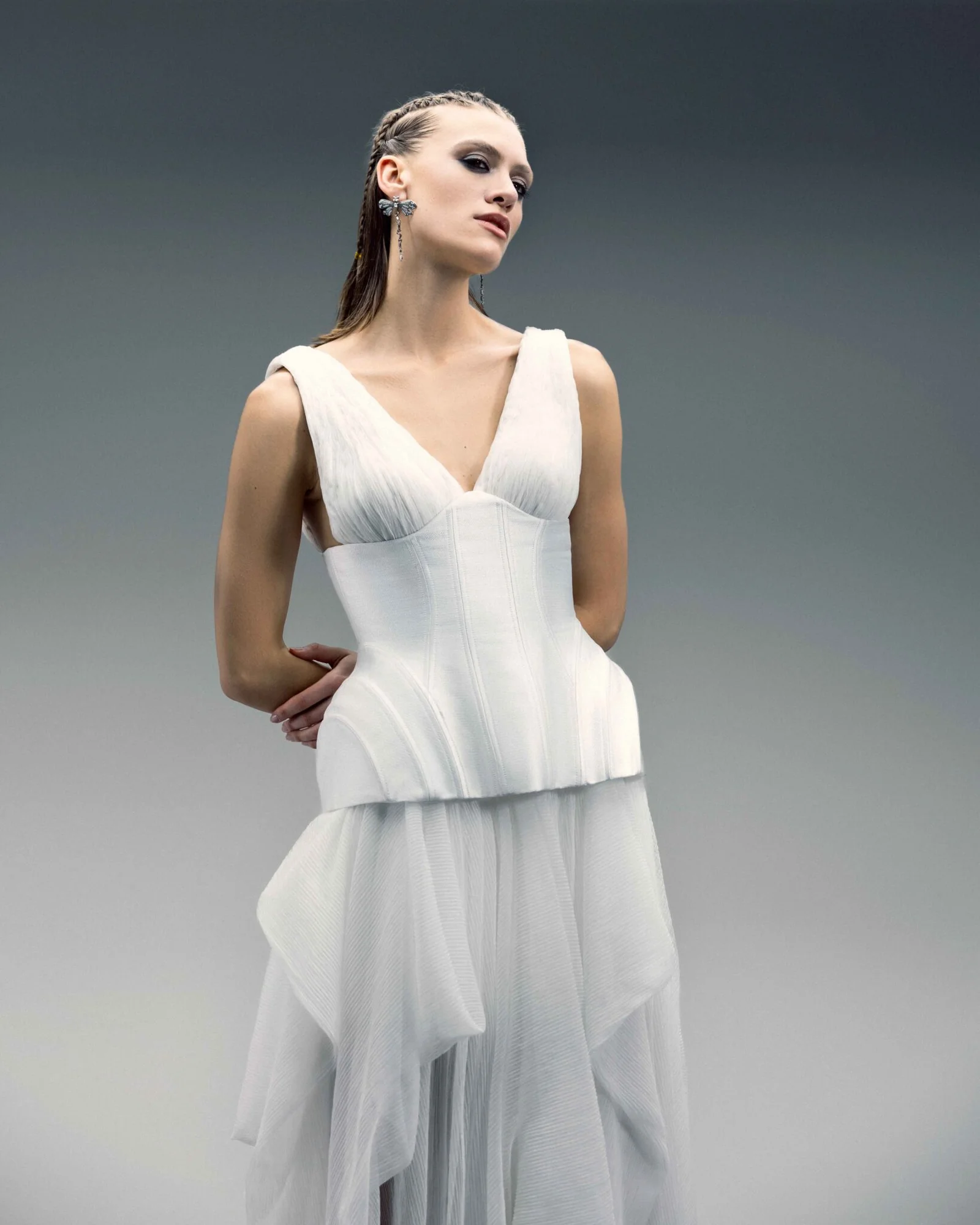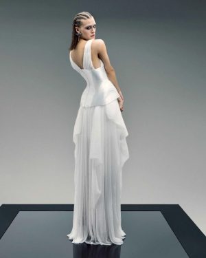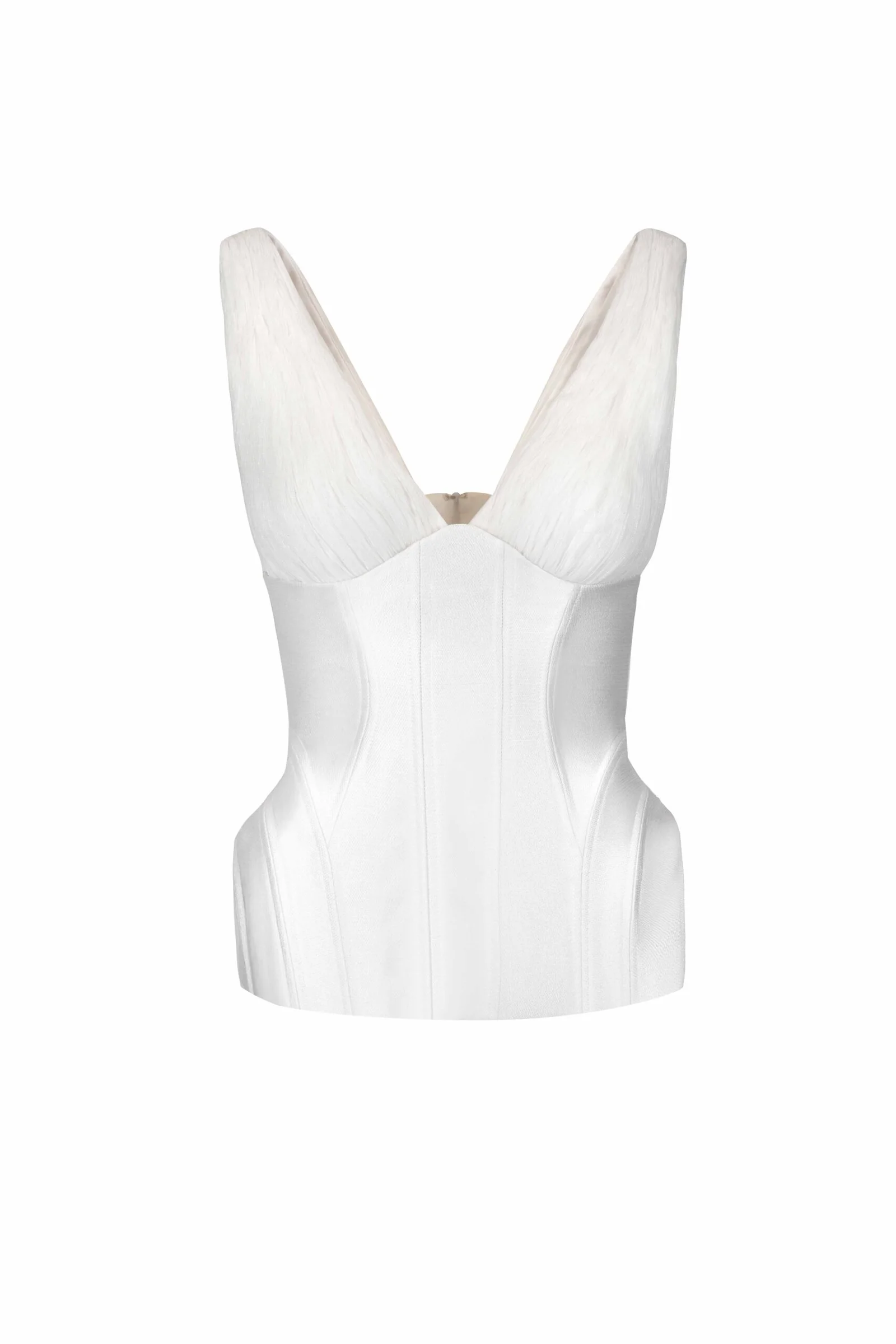 Exude elegance in this off-white top blending architectural form with ethereal texture, crafted from structured Mikado piqué and softened with layered pleated chiffon at the bust and shoulders. The fitted bodice is designed to sculpt the waist and support the figure with a contoured silhouette, while the chiffon inserts add softness and movement.
