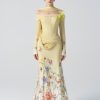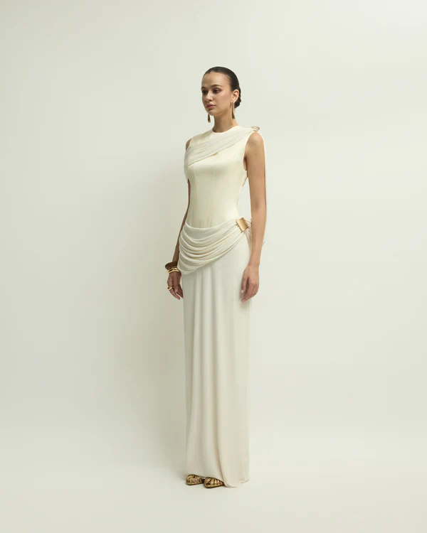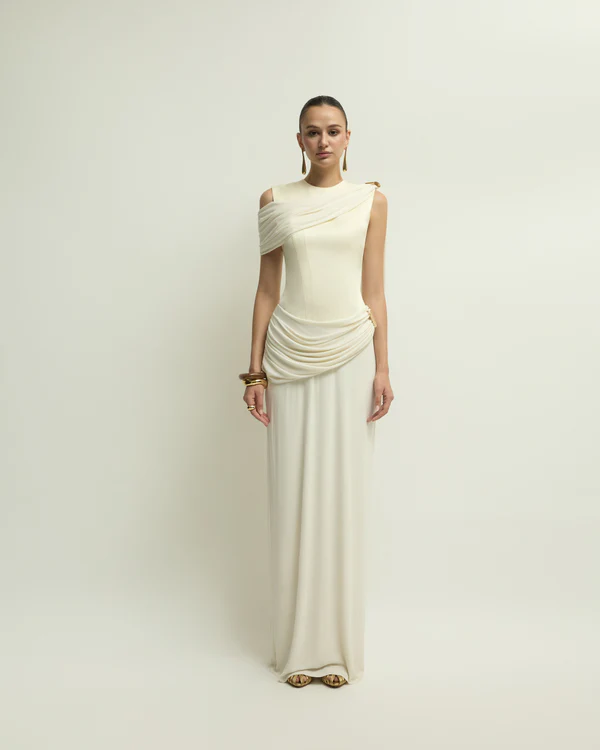 NIMES DRESS is a feminine dress featuring sophisticated draping techniques, creating soft folds on the bodice and shoulders, which are then fastened with large square brooch.