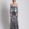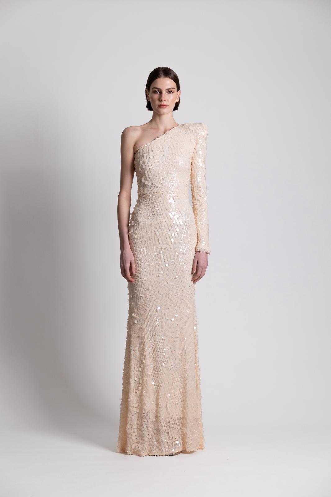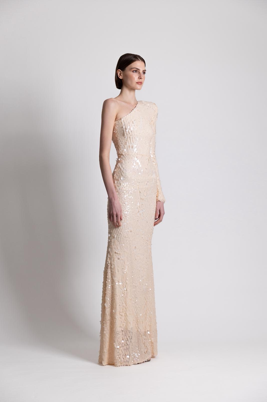 Featuring an asymmetric, one shoulder design.