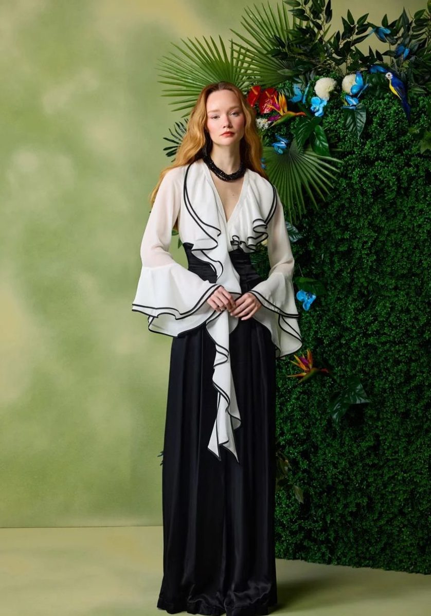 A black and white dress with long, ruffled sleeves.