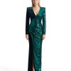 A fully lined, easy fit stretch sequin gown with velvet panels.
