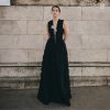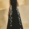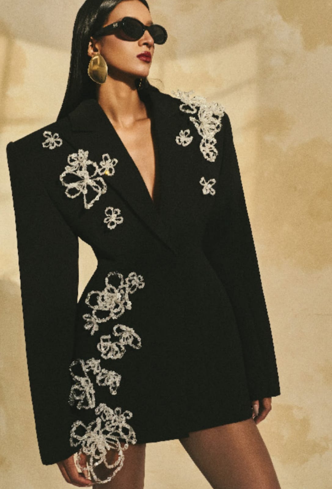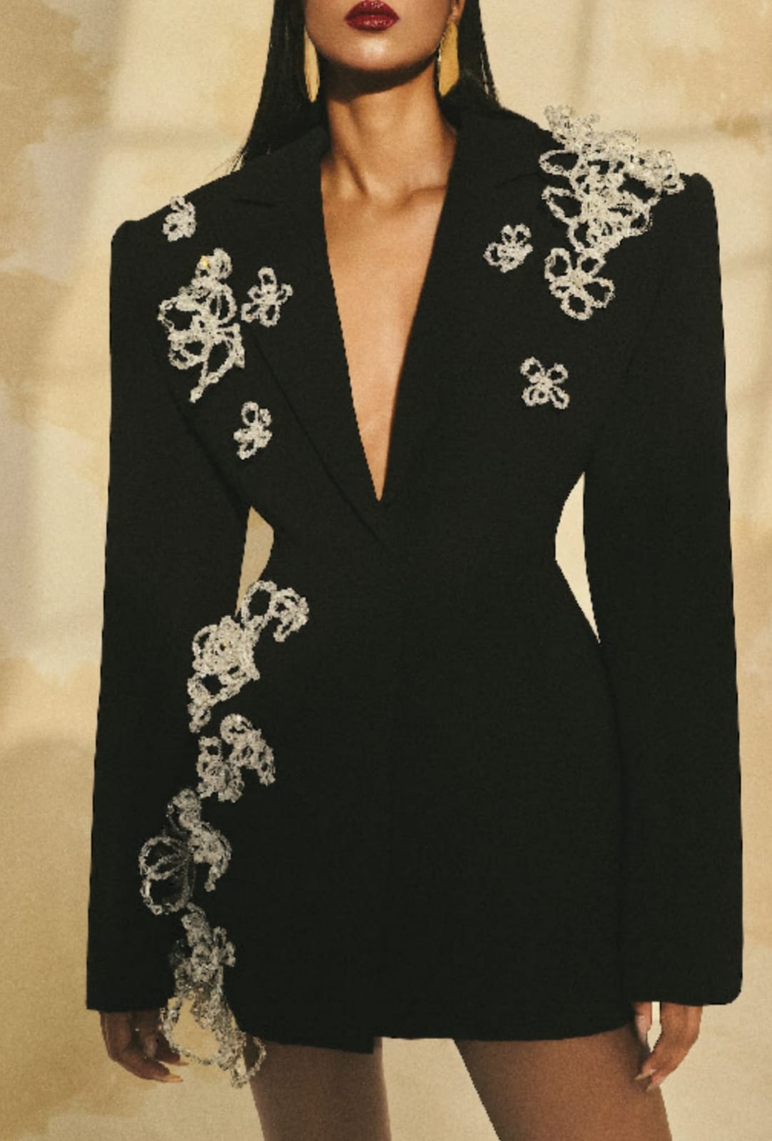 A classic single-breasted black blazer with a notched lapel, elevated by extensive white, shimmering appliques in the shape of flowers and butterflies.