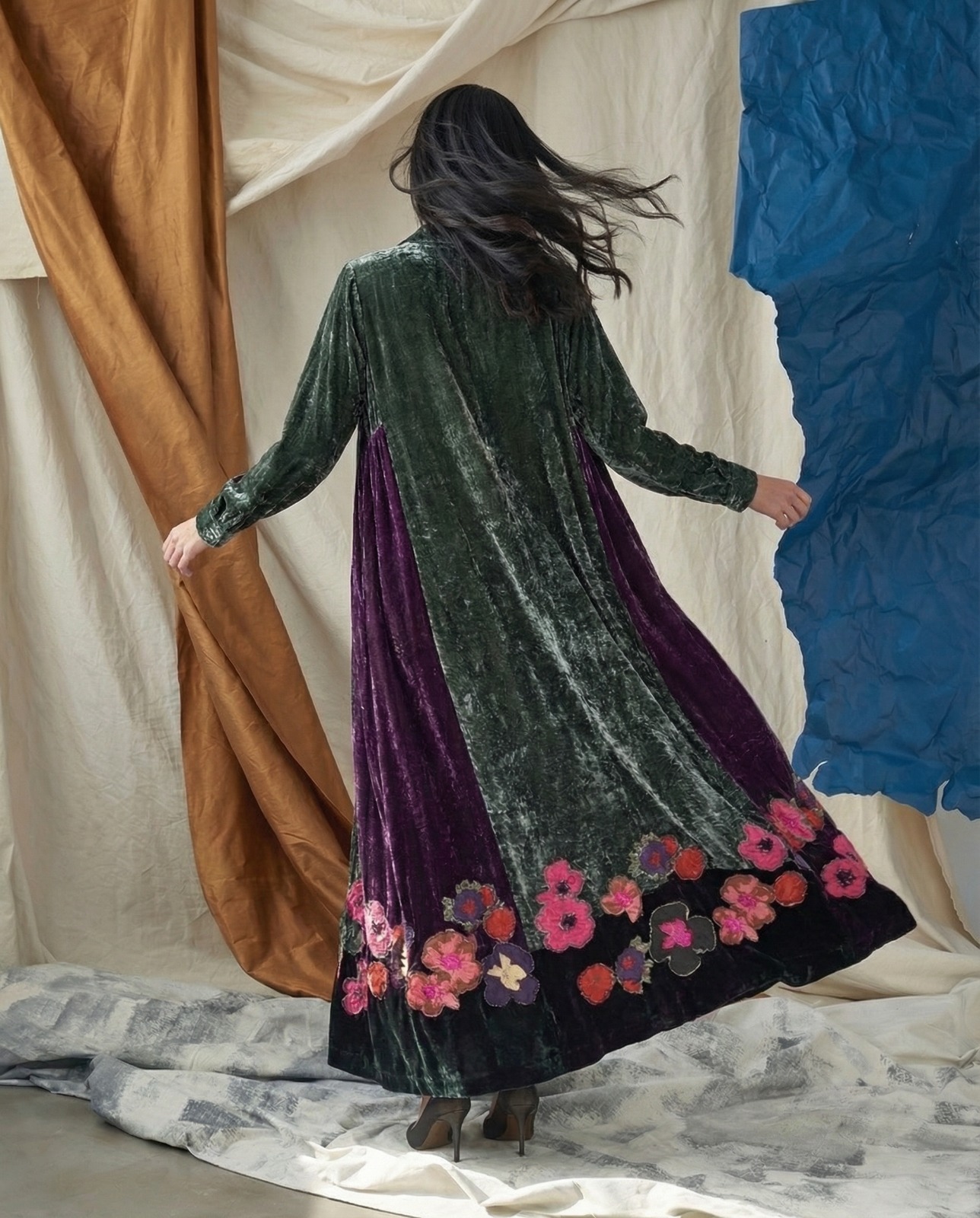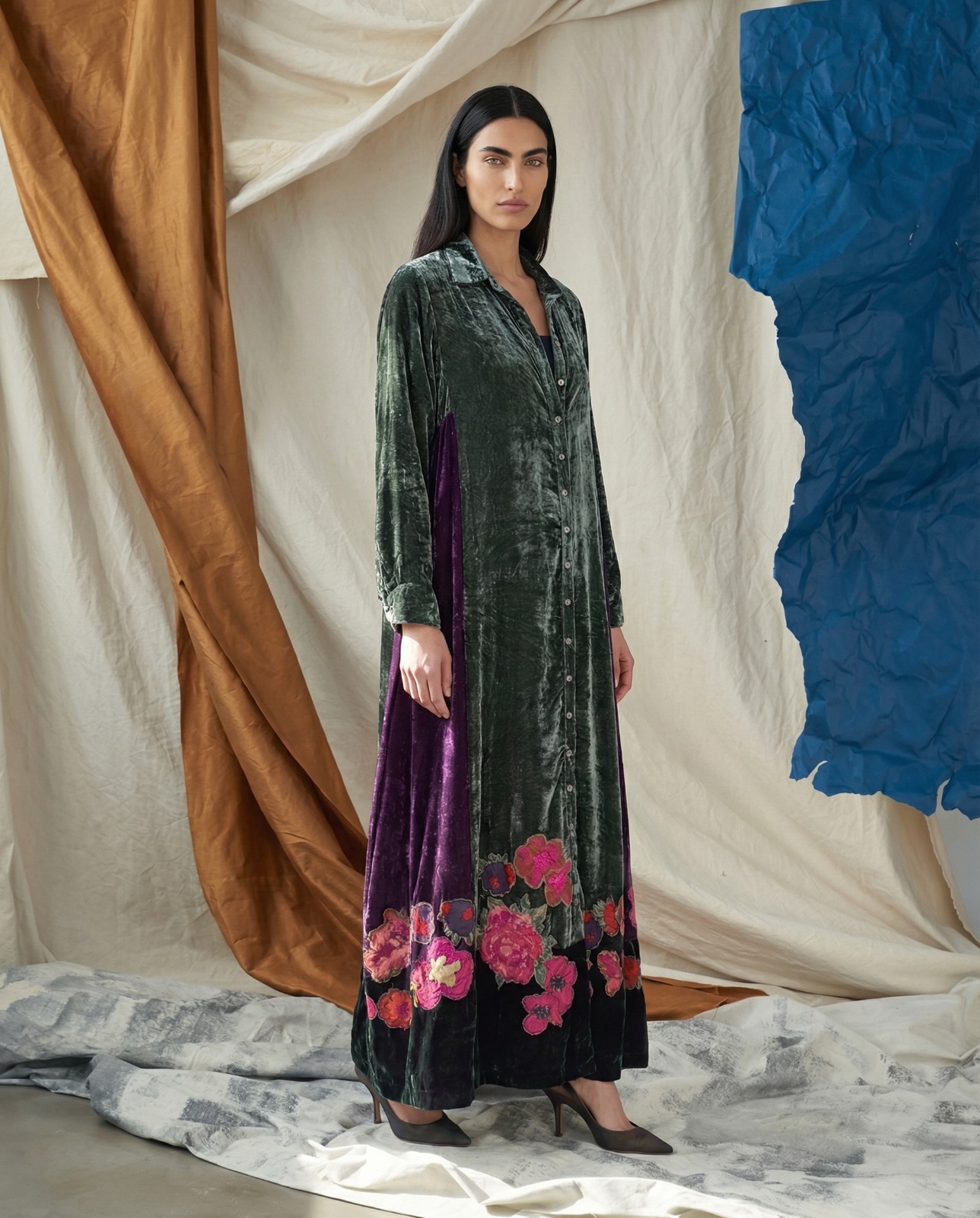 Long sleeved, button-down shirt dress made from a crushed velvet material.