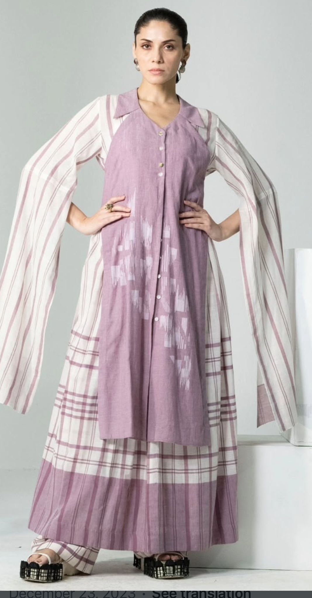 The outfit appears to be a long tunic worn over a matching long skirt or trousers.