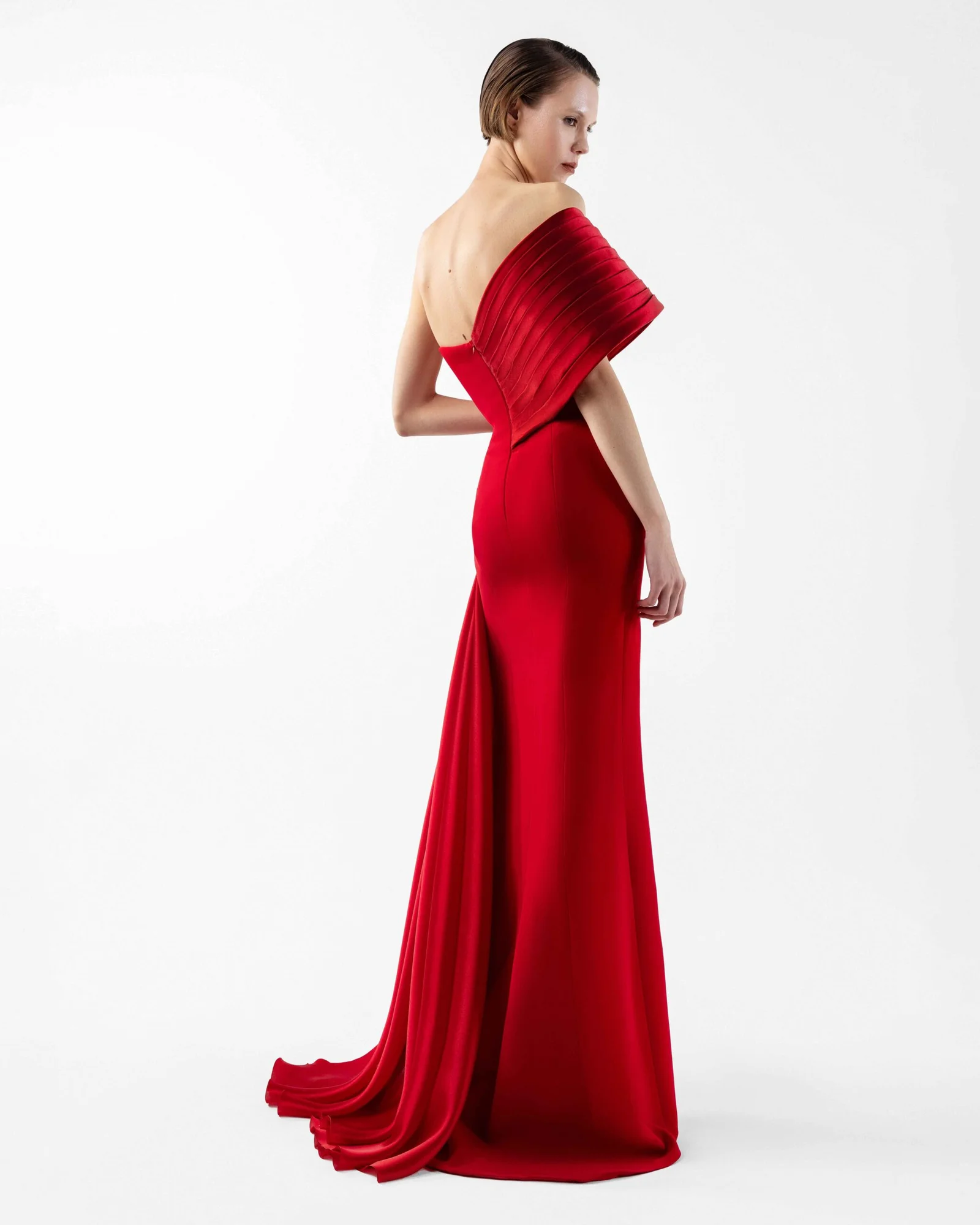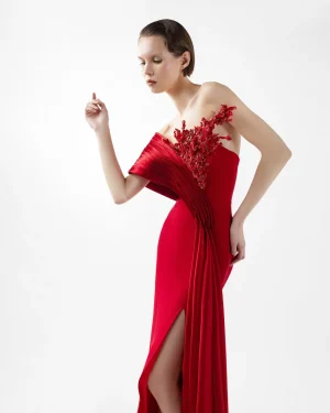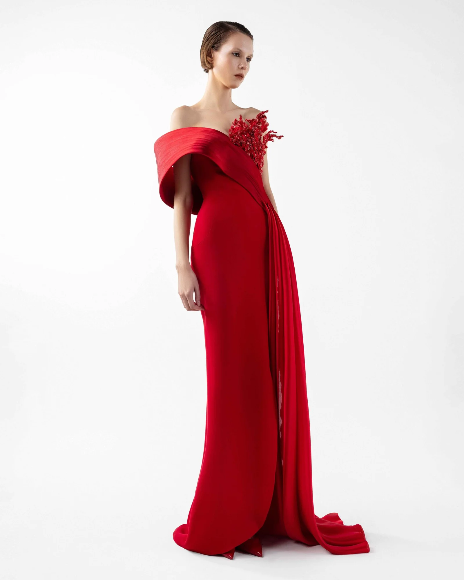 It features a ruched off-shoulder neckline and intricateStriking in Crimson, this red crepe gown features a sculpted silhouette framed by a dramatic pleated organza panel draped off-shoulder. A burst of intricate hand-embellishment adorns the bust, adding dimension and texture. The gown falls into a fluid train around a high slit with soft pleats that echo the neckline’s architectural folds. Bold, refined, and unapologetically powerful. red beading on the bodice.