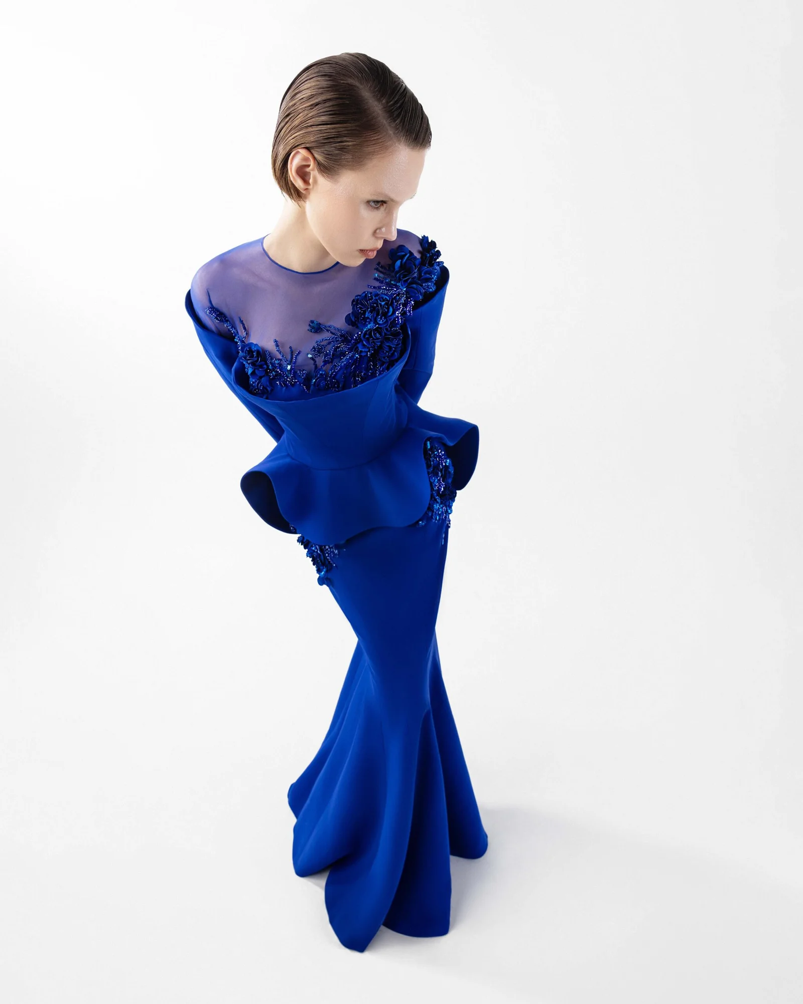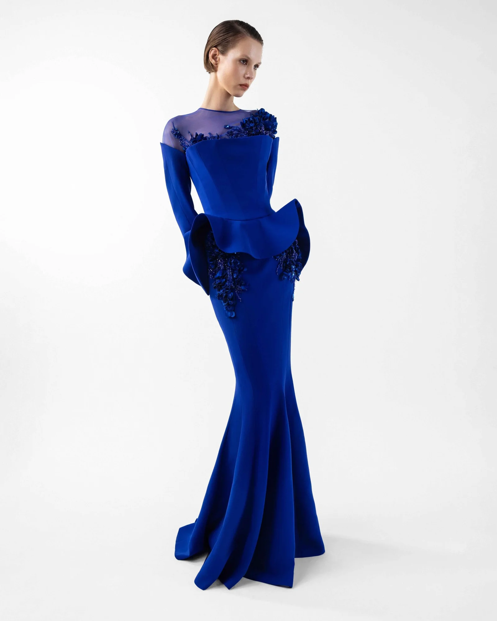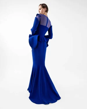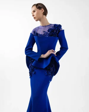 Exude regal sophistication in this royal blue crepe gown, meticulously tailored with a flattering mermaid silhouette that beautifully accentuates your curves. The design features an exquisite illusion tulle neckline, elegantly adorned with intricate handmade embroidery that flows gracefully over the décolletage and shoulder. Long, sleek sleeves complement the overall refined aesthetic, while a stylish peplum detail at the waist adds a contemporary architectural flair. Perfect for making a grand statement, this gown is ideal for formal galas, exclusive events, and red carpet occasions.