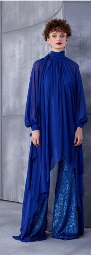 Featuring a long-sleeved, high neck sheer top paired with matching sequined wide-leg pants.