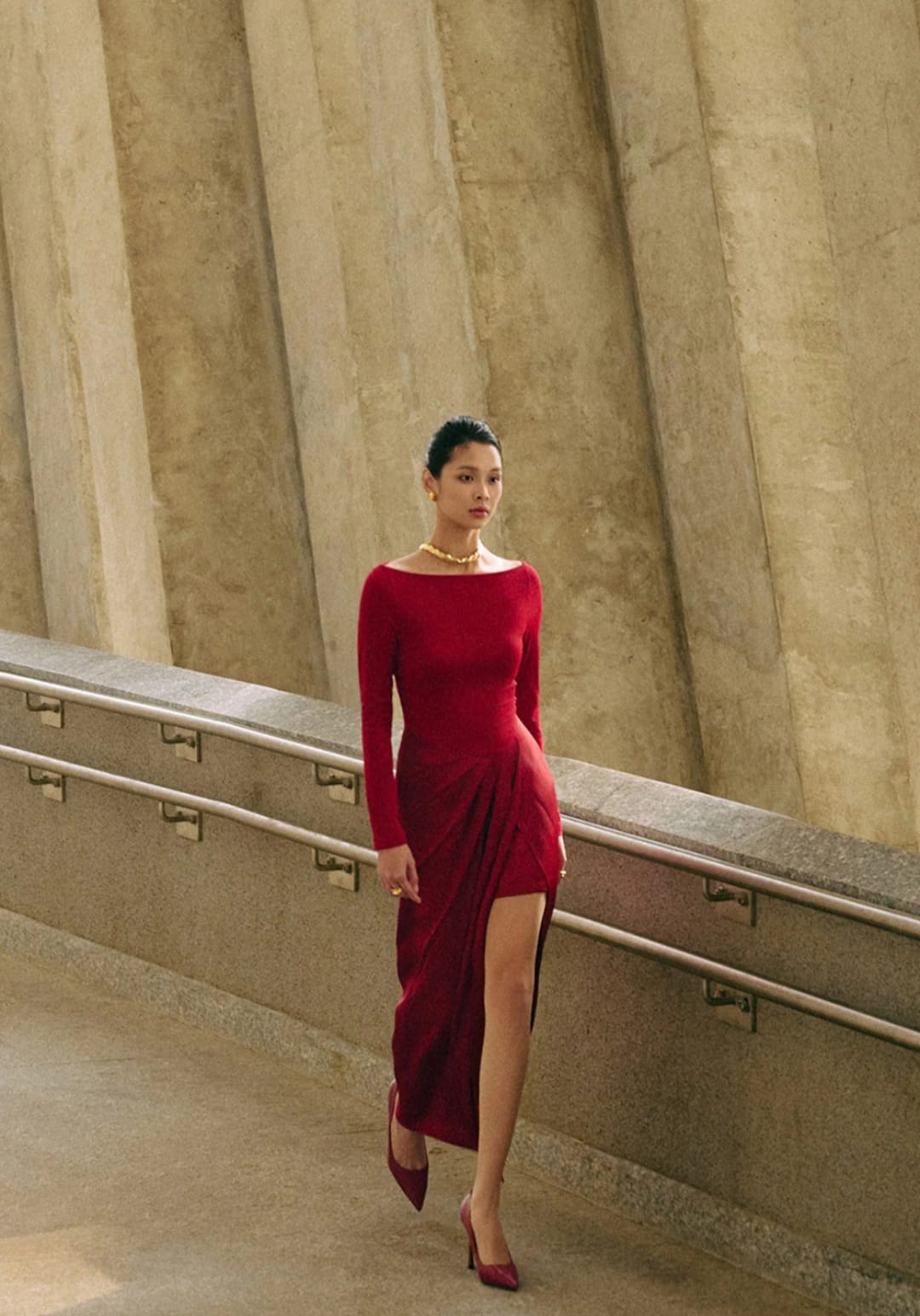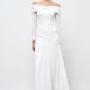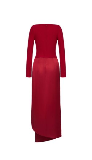 A long sleeved midi dress featuring a draped front, high leg slit and boat neckline.
