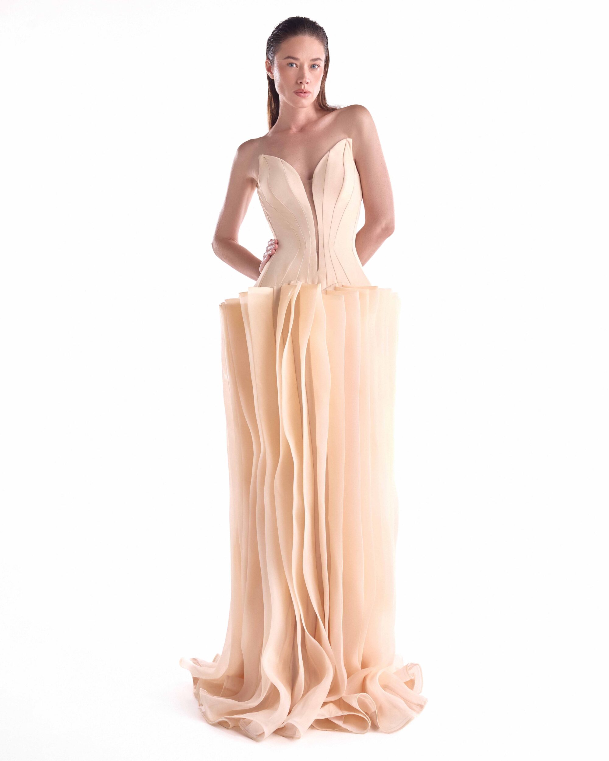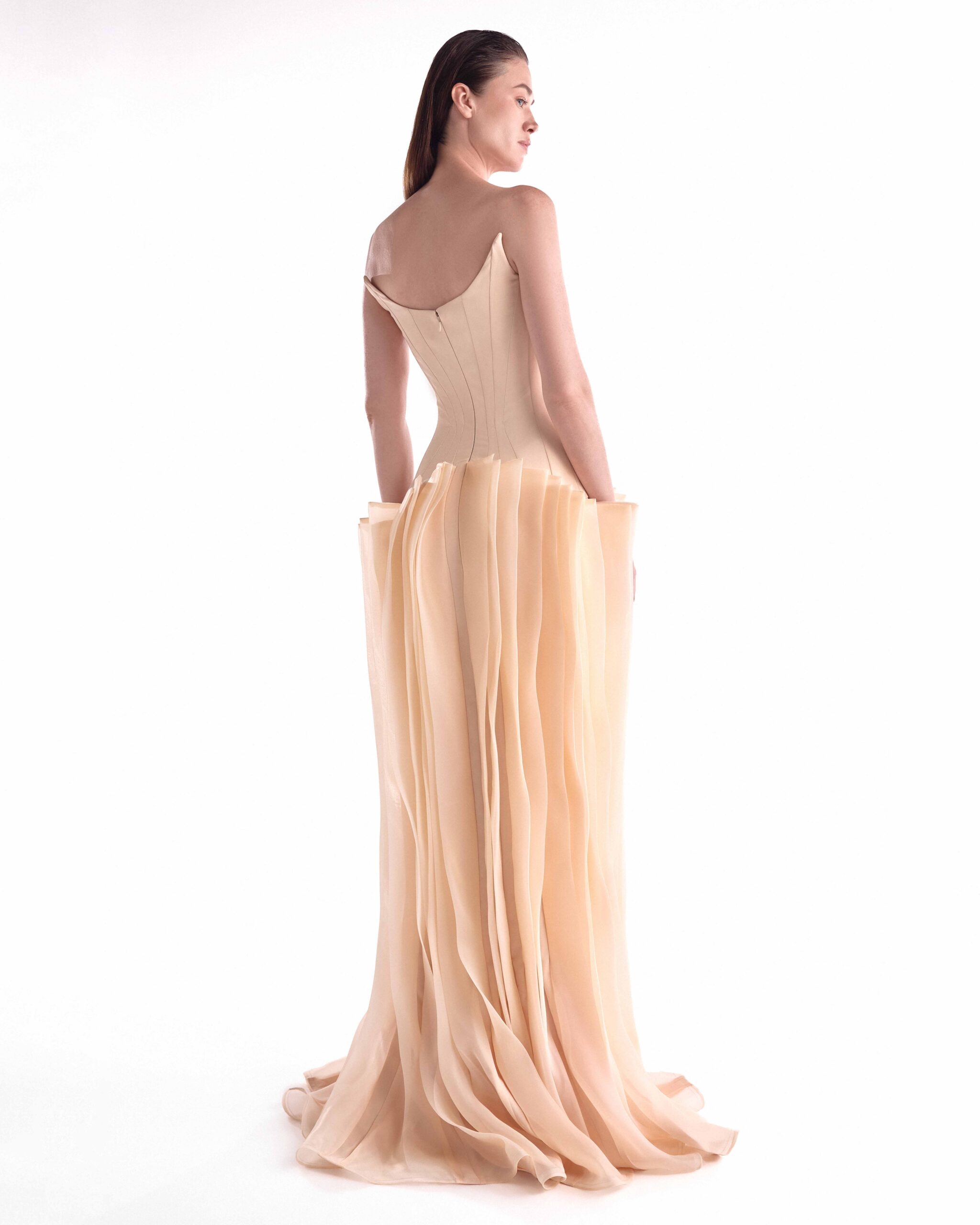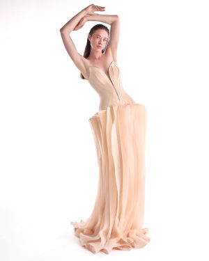 Sculpted sophistication defines this nude evening gown, designed with a deep V cut and angled bustline that enhances the neckline with modern elegance. The crepe corset contours the waist with precision, creating a structured yet fluid silhouette. A layered organza skirt cascades in soft vertical waves, adding movement and dimension perfect for galas, red carpets, and high-profile celebrations.