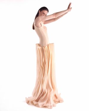 A striking blend of structure and softness, crafted in angular deep V nude crepe bodice and floating organza layered skirt for an effortlessly refined presence.
