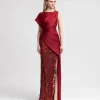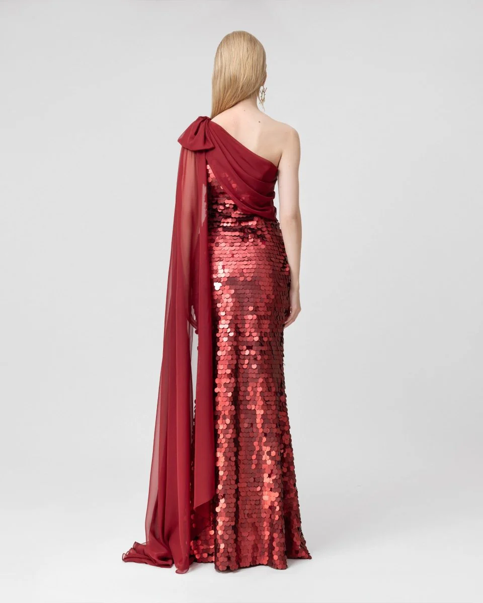 Sequin long dress with asymmetrical cape-like sleeve featuring a bow detail on the shoulder.