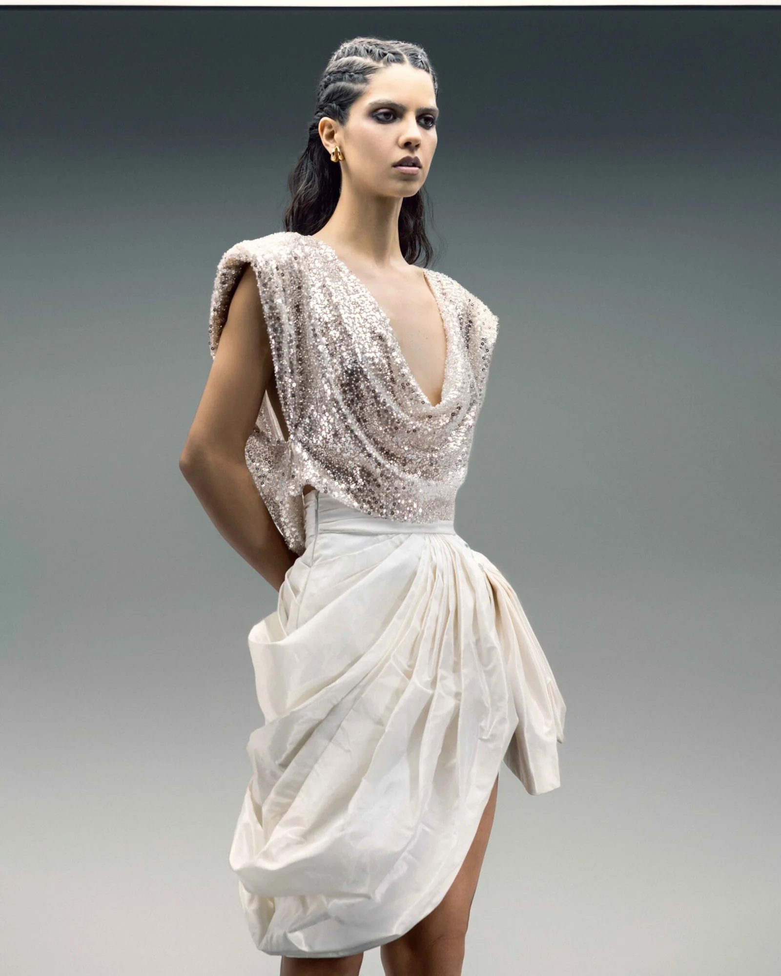 Crafted in shimmering Gold sequins, this sleeveless top features a soft cowl neckline that mirrors a deeper drape at the back, revealing the skin with subtle sensuality. The fluid construction falls gently from the shoulders, creating a graceful silhouette that glistens with every movement. Designed to embody effortless glamour, the open sides enhance its sculptural drape while maintaining a refined finish.