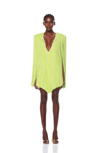 Green tasseled mini dress with a squared shoulder and deep neckline.