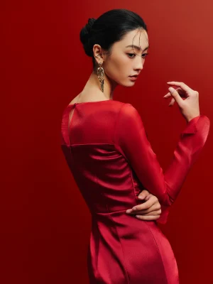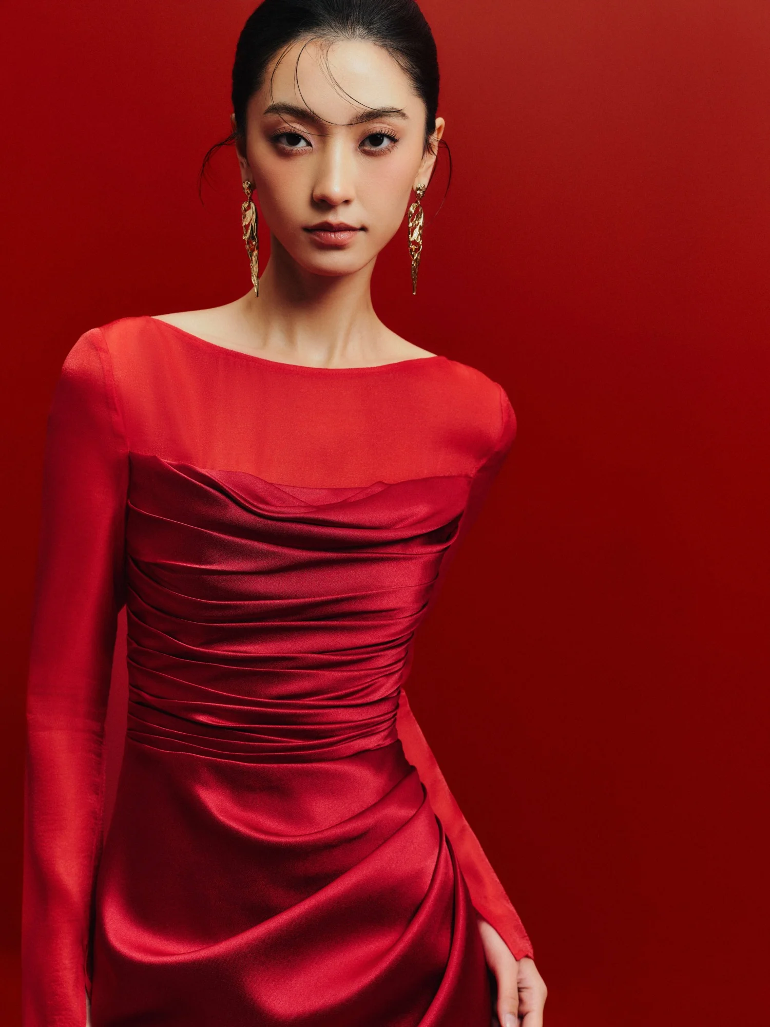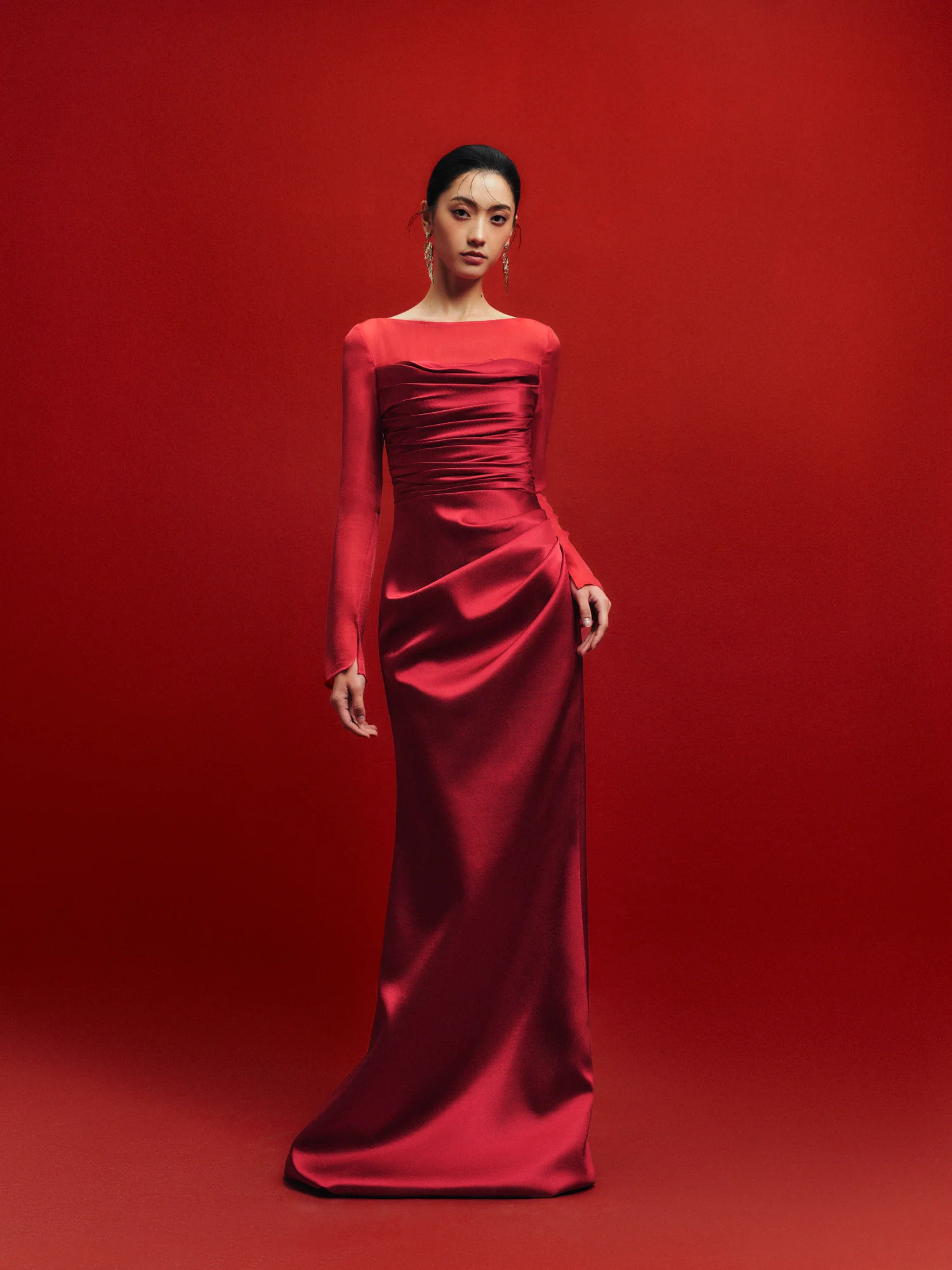 A vision of bold elegance and timeless sophistication. Draped in luxurious satin with meticulous ruching details, this gown embodies power and grace in every step.