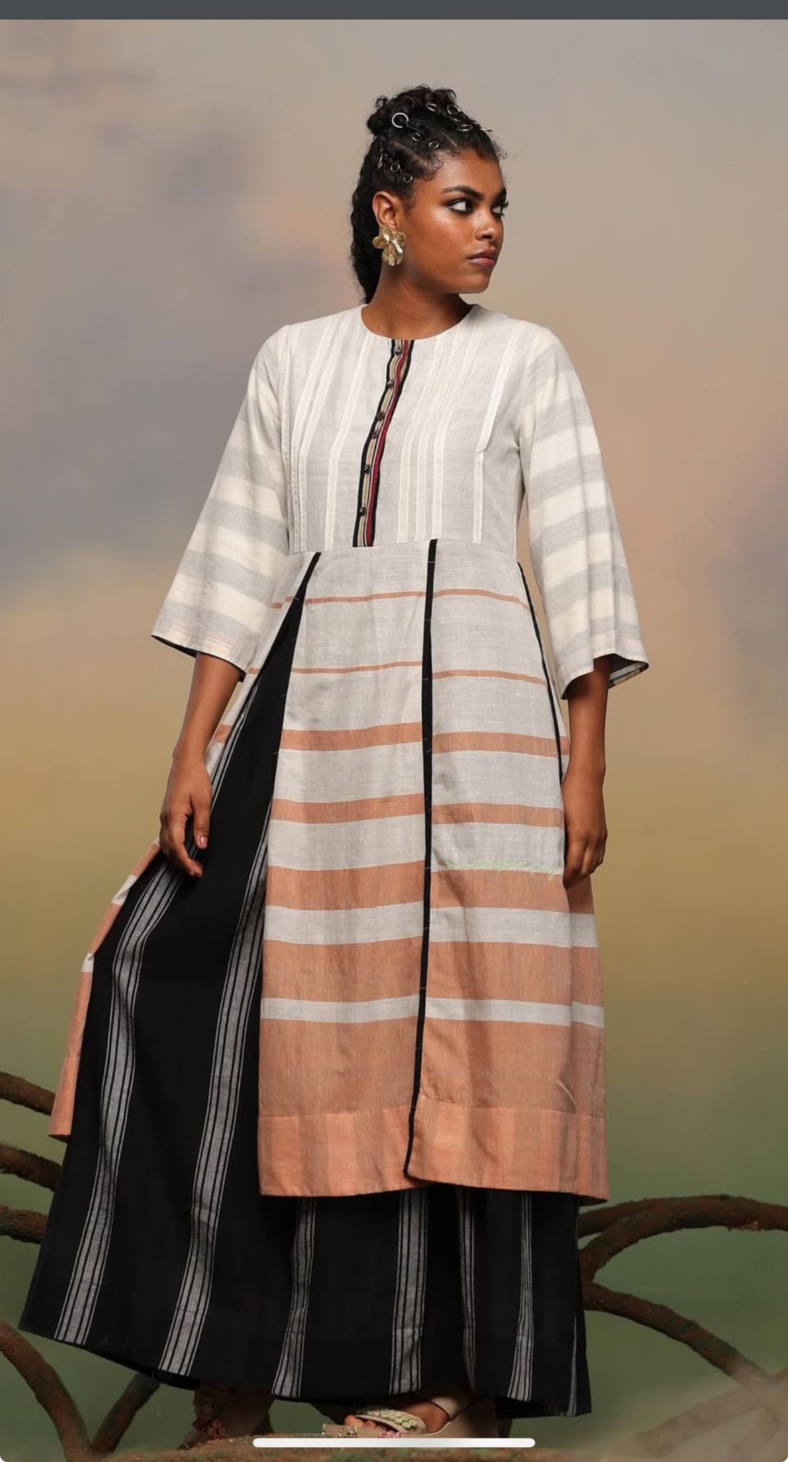 Wearing a striped, asymmetric handloom kurta set.