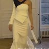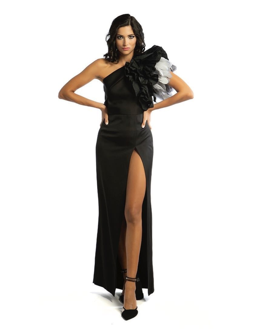 A black, one-shoulder silk dress featuring dramatic goose feather detailing on the shoulder and a high front slit.