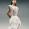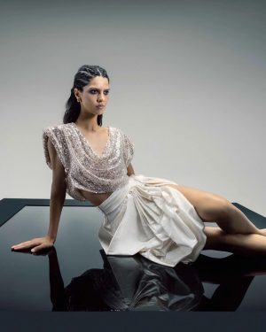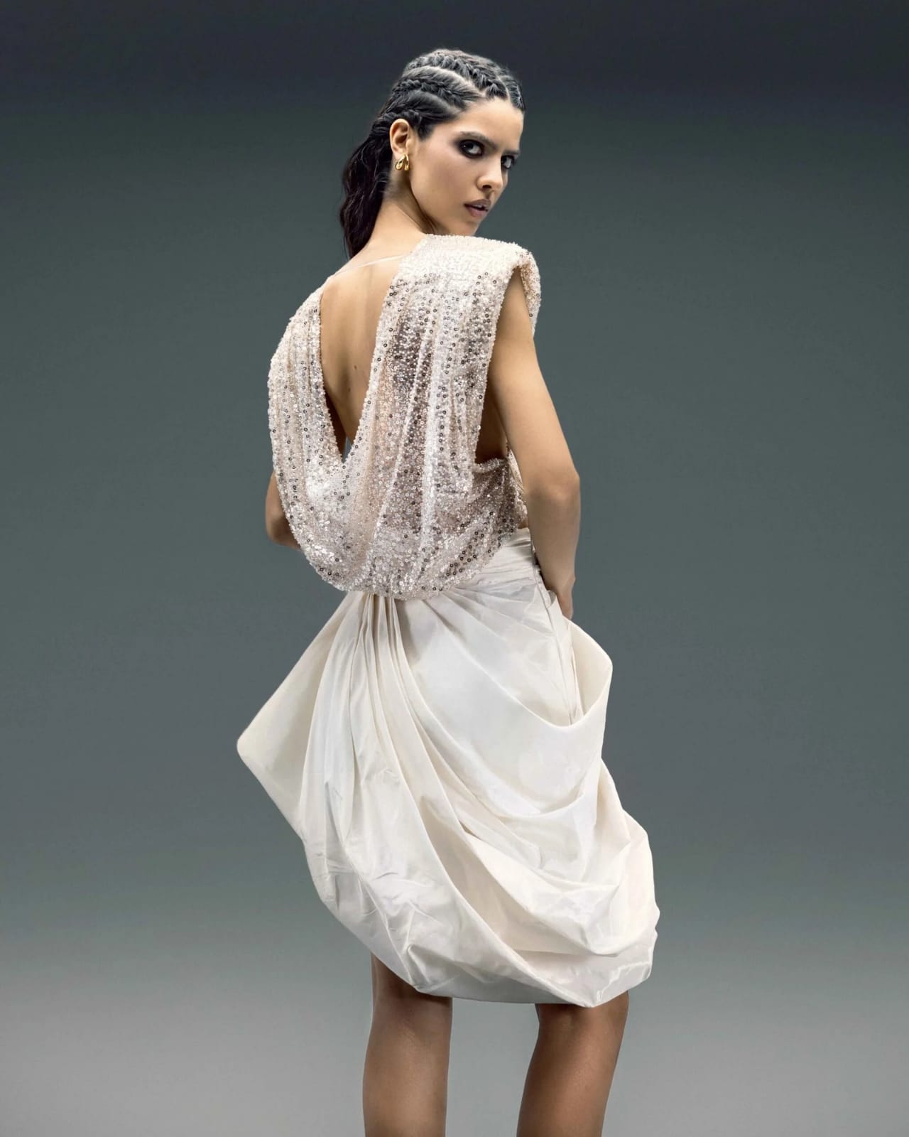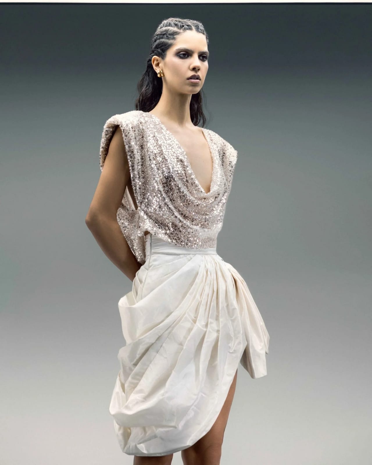 Elevate your evening look with this structured mini skirt in luxurious off-white taffeta. Designed with a high waist and asymmetrical draping, it features voluminous pleats that sculpt the hips and a slit. The rich texture and architectural folds make it an unforgettable statement piece for cocktail parties, red carpets, and high-fashion events.