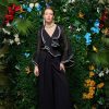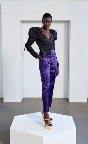 Wearing a black blouse with dramatic puff sleeves.