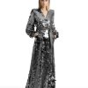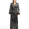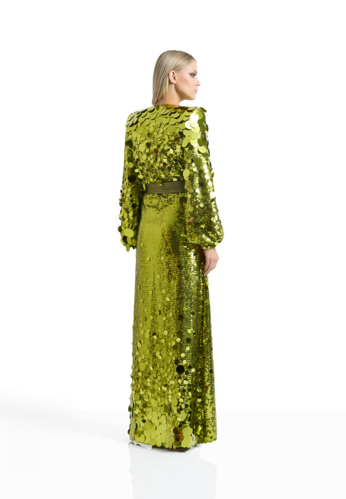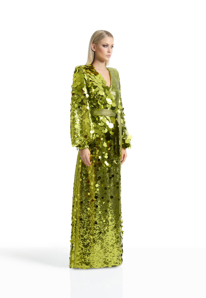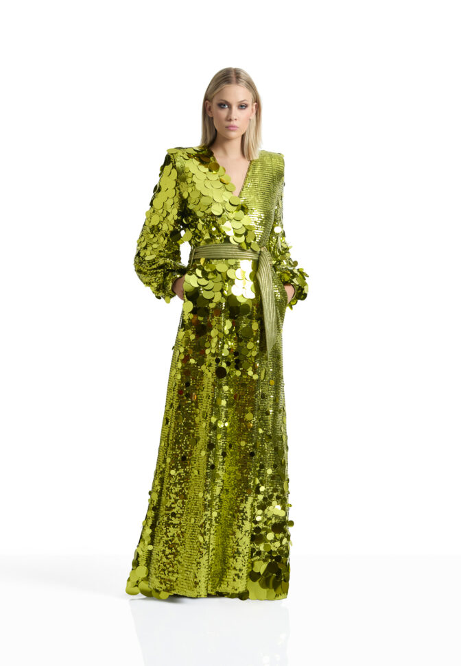 A WRAP STYLE GOWN IN STRETCH SEQUINS WITH TIE CLOSURES, STITCHED SATIN BELT, BILLOWED SLEEVES AND SHOULDER ACCENTS.