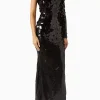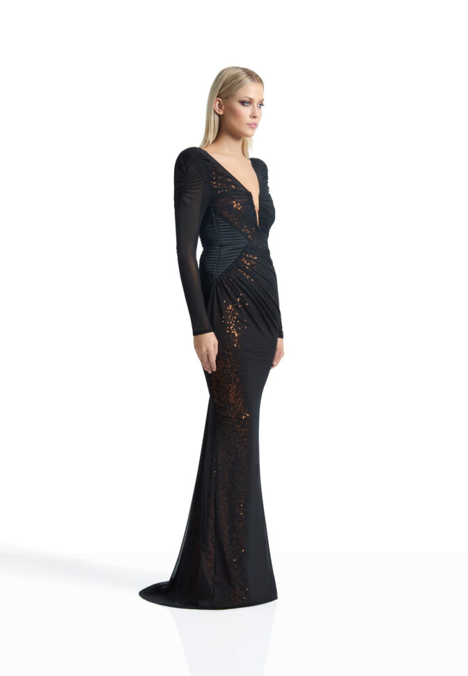 A SHEER GATHERED BODICE MESH GOWN WITH SHOULDER ACCENTS AND SEPARATE FULL LENGTH SEQUIN SLIP – CAN WEAR SEPARATELY.