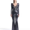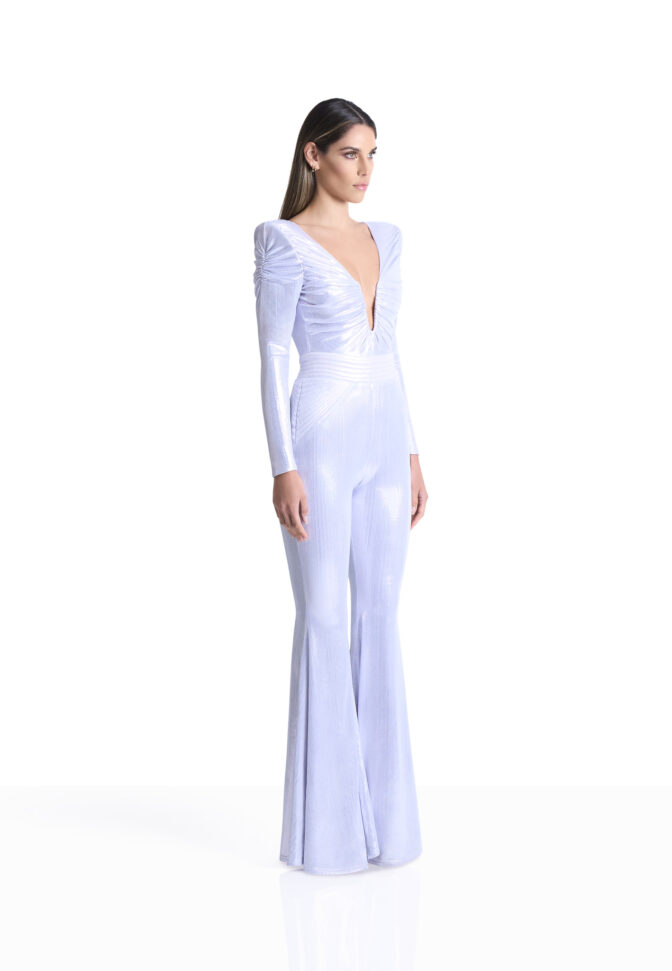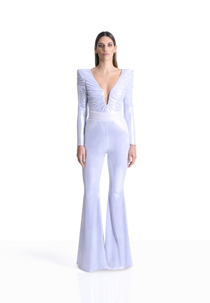 Metallic jersy jumpsuit with gathered feature bodice, stitched paneling, flared pants & shoulder accents