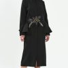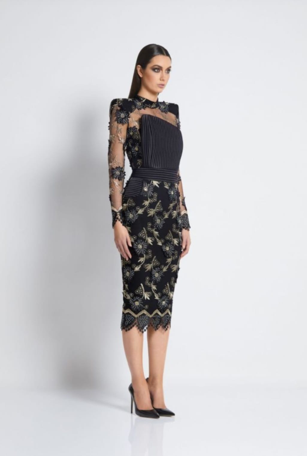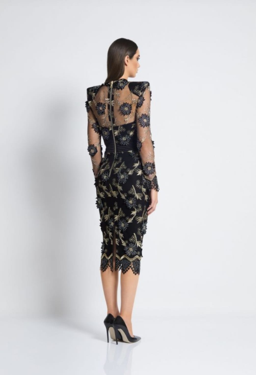 A black embroidered midi dress.