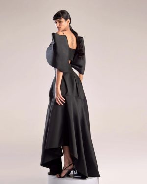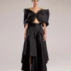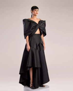 Introducing our statement top made from luxurious black taffeta, featuring an oversized bow design that adds a dramatic flair to any outfit. The rich texture and structured silhouette offer a sophisticated yet bold look, making you feel both elegant and powerful. This unique, fashion-forward piece can be paired with our skirt for an unforgettable ensemble that exudes confidence and style.