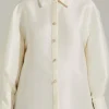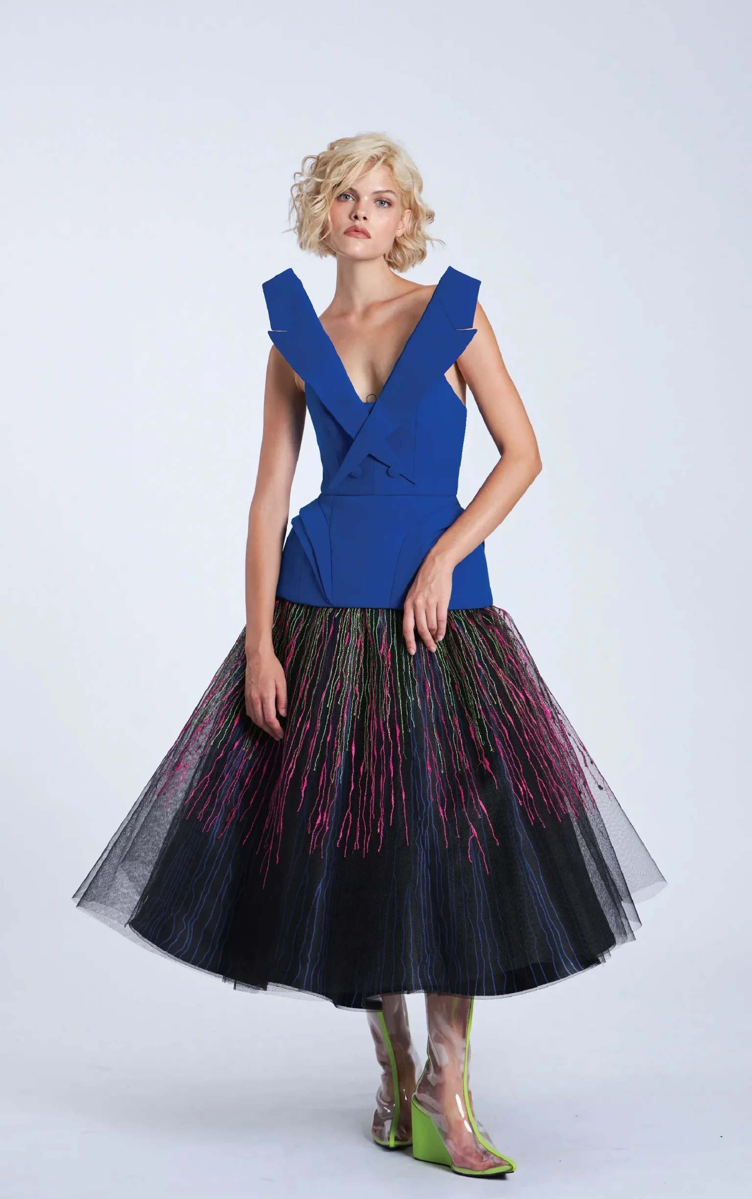Bright blue top with a unique, structured v- neck design and dramatic exaggerated shoulders.
