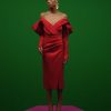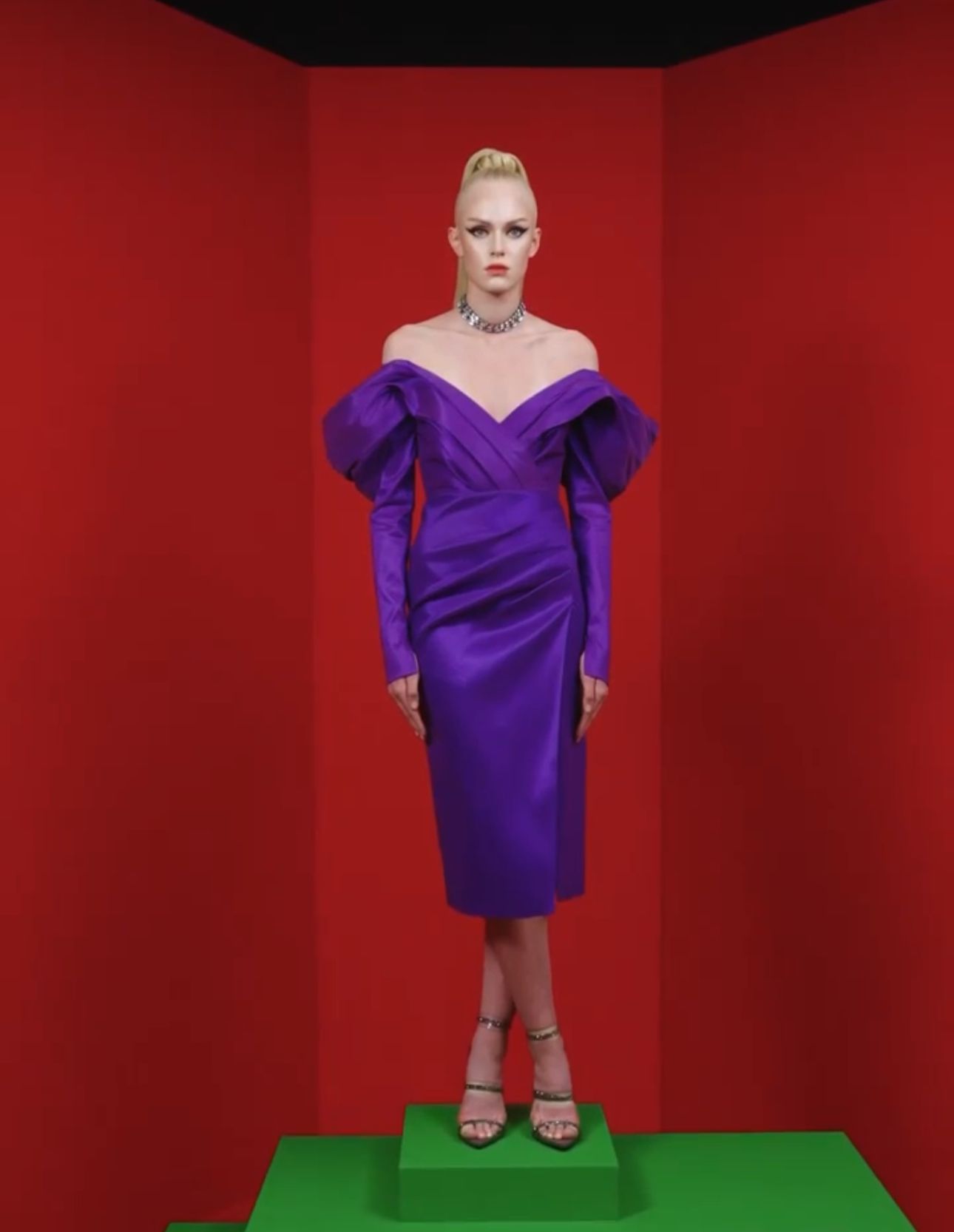 Violet off-the-shoulder midi dress.
