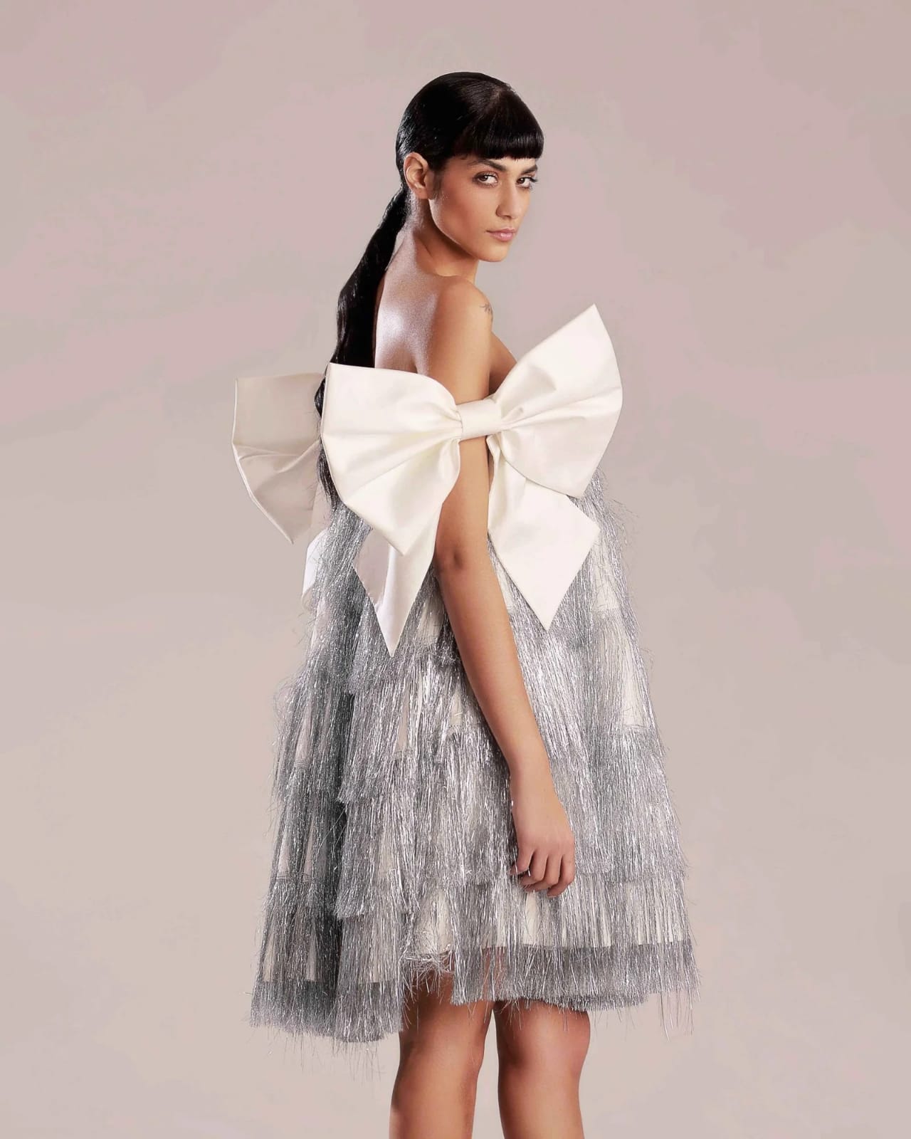 Embrace whimsical elegance with this stunning dress crafted from Silver Feathered Fabric and accented with White Taffeta Bow Ties. The unique cut and flared shape create a playful yet sophisticated silhouette, perfect for making a statement. The luxurious textures and bold design evoke a sense of confidence and charm.
