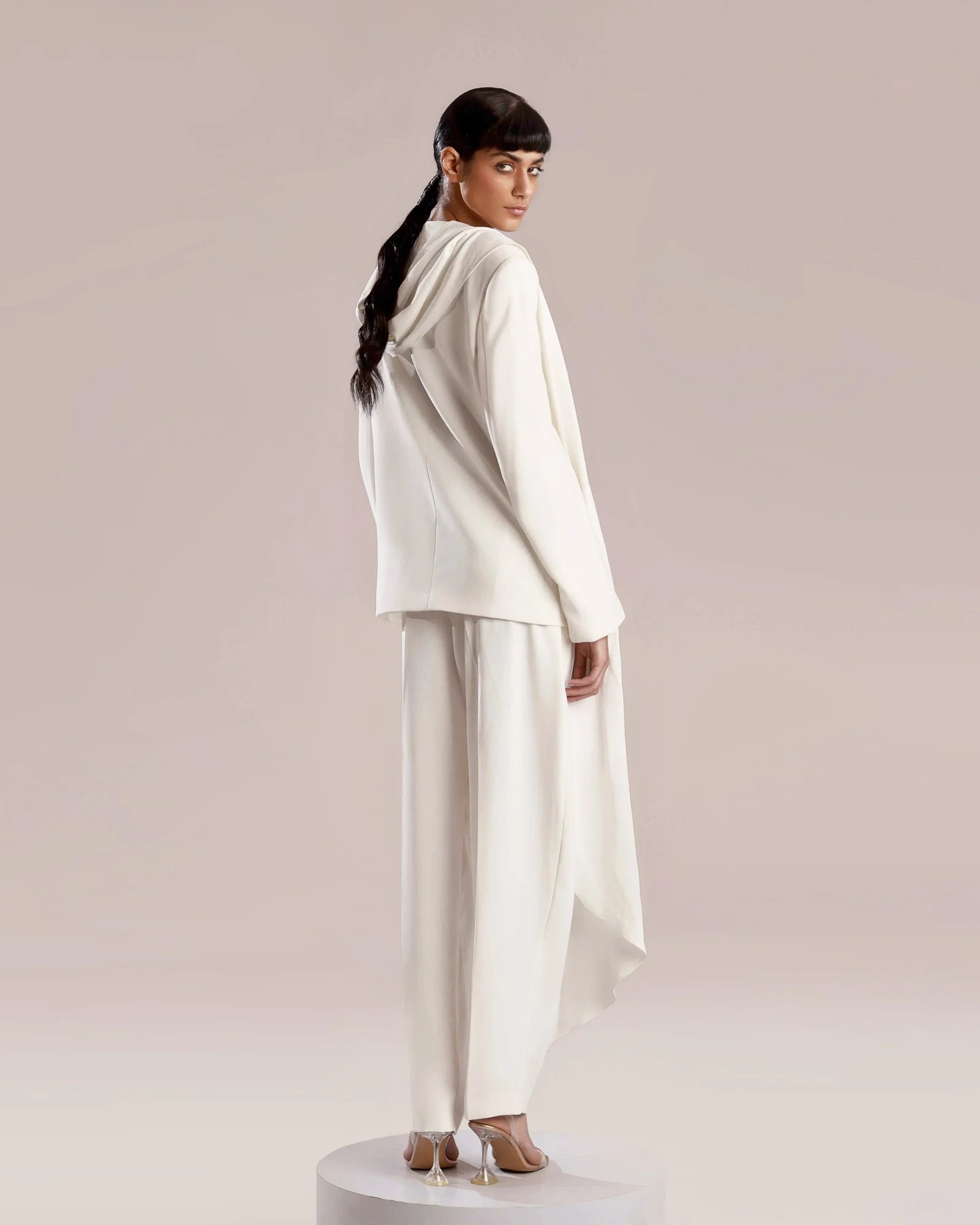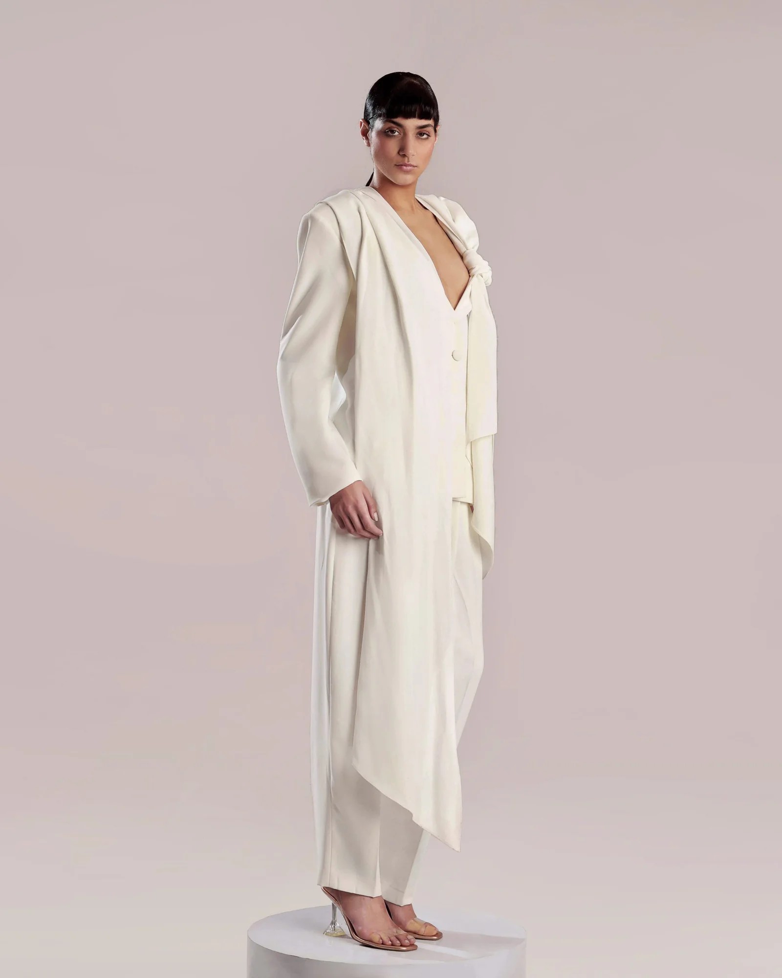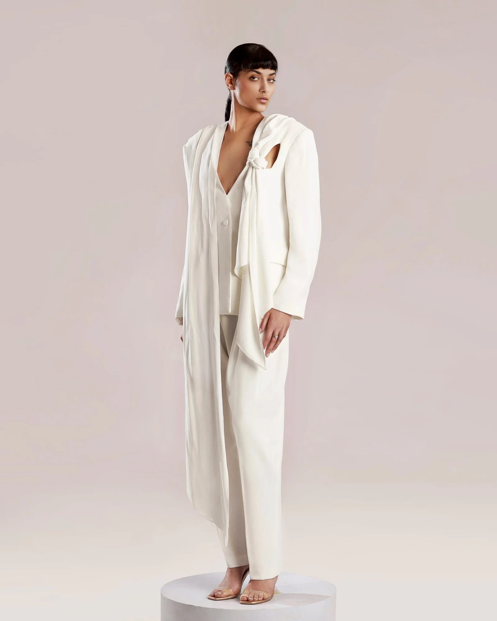 Elevate your style with this elegant white crepe jacket, featuring a feminine cut and a graceful shawl made from crepe georgette. The refined shape creates a timeless and chic silhouette, perfect for any occasion. Pair it seamlessly with our pants for a complete and polished look.
