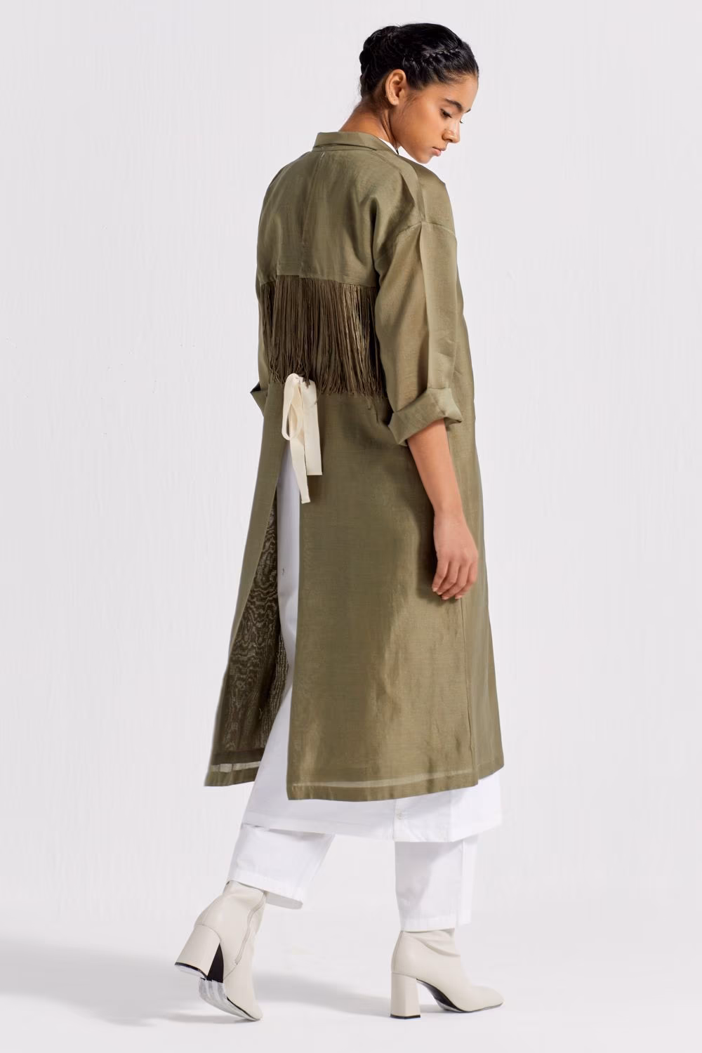 Olive green jacket, also referred to as an overlay or duster, styled over a white top and white trousers.