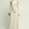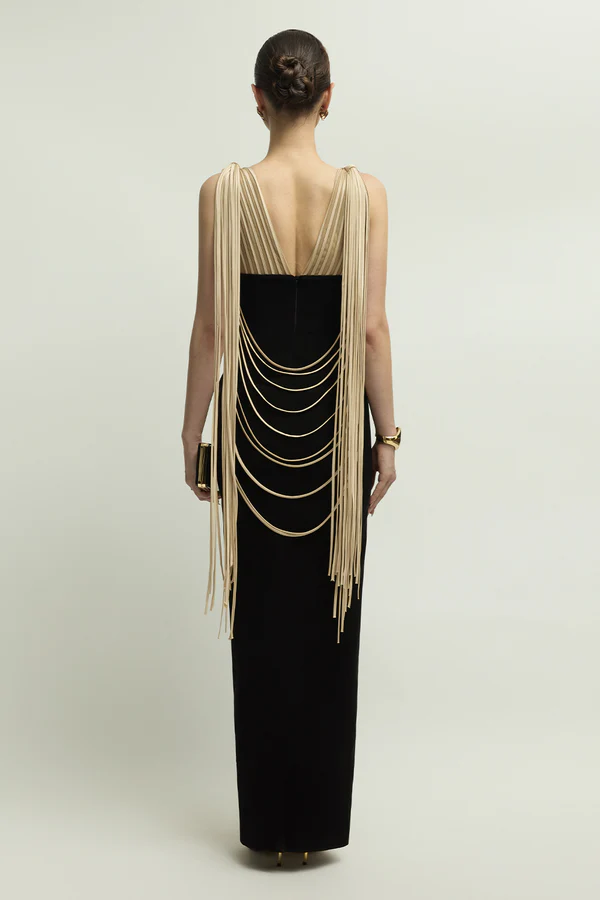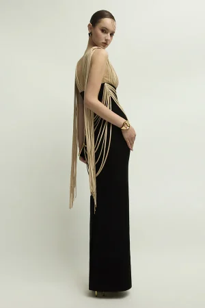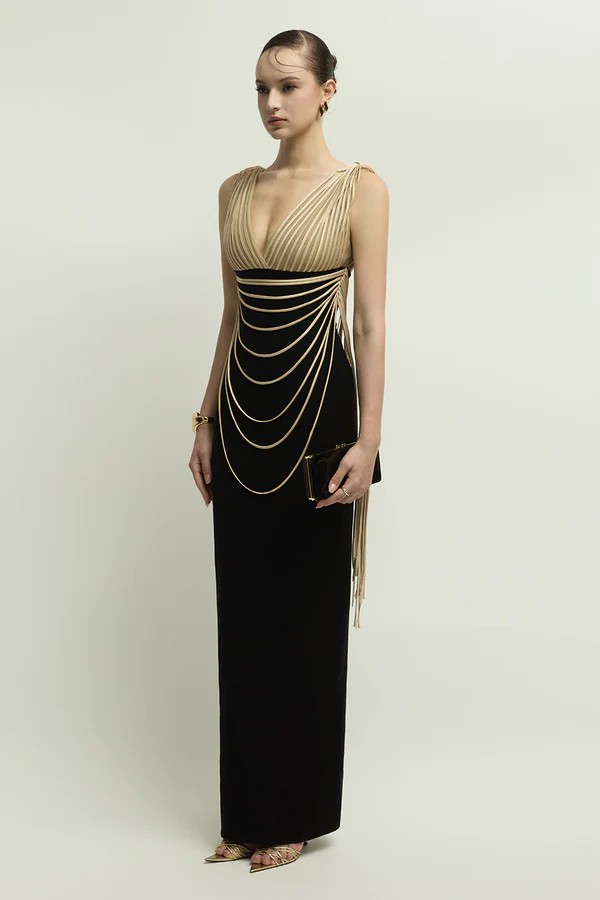 Expertly crafted from luxe crepe, this sheath maxi dress features a sophisticated V-neck and a distinctive chain embellishment. Its sleek silhouette flatters for formal events, evening soirées, or elegant dinners.