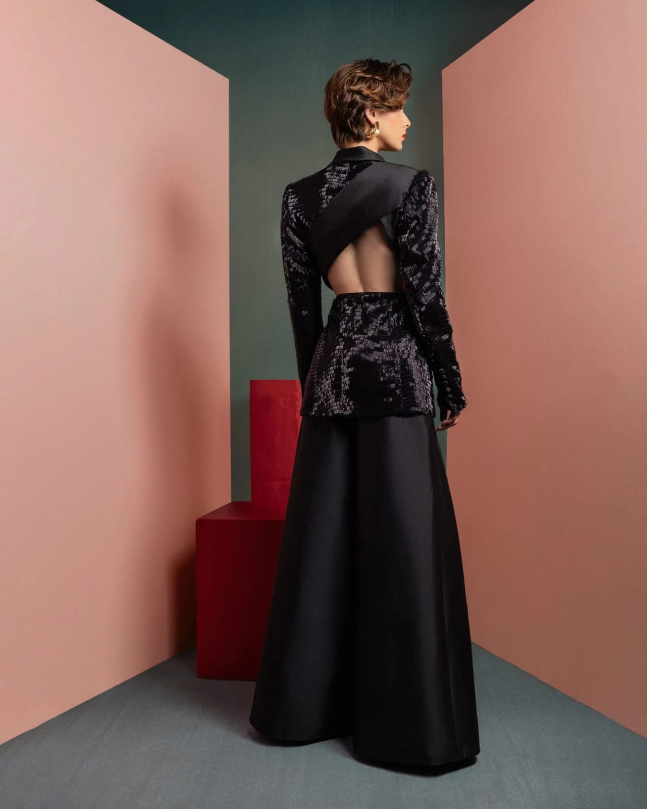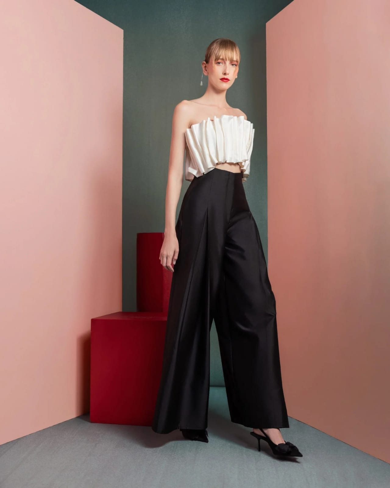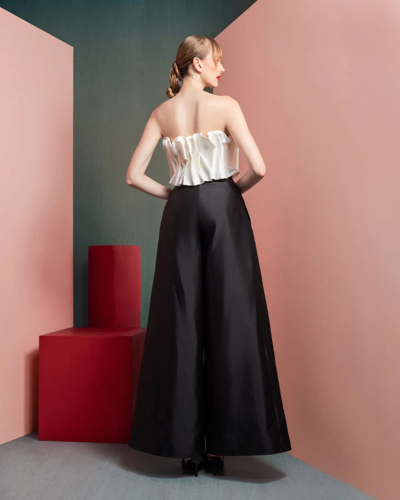 Embrace fashion with our wide-leg taffeta pants, crafted from luxurious taffeta with a subtle sheen. The dramatic wide-leg cut creates an elegant silhouette, while the high-waisted design ensures a flattering fit. Ideal for pairing with our Sequin Blazer , these pants add a touch of refinement to any ensemble.