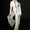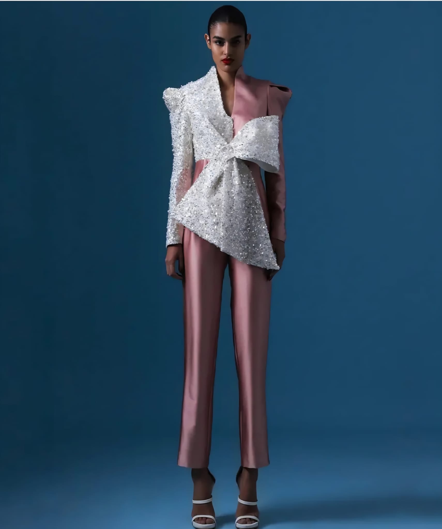 A blush pink jumpsuit a heavily sequined white asymmetrical with a large bow detail.